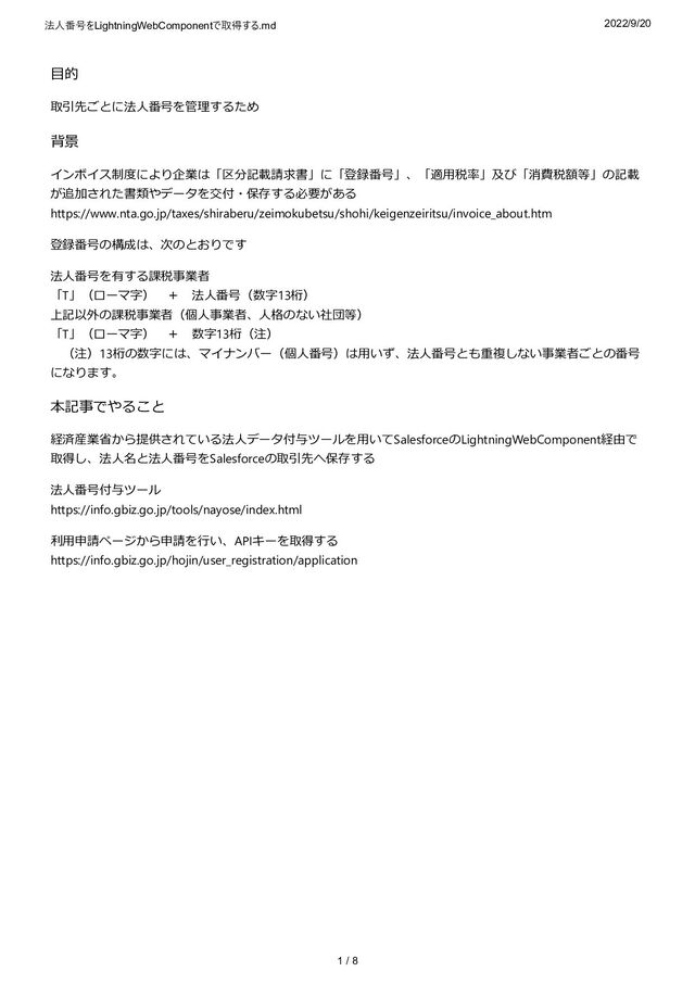 class CorporateInformationController { @AuraEnabled (cacheable=true) public static Map<String, Object> wireSimpleOrComplexData(String accountId) { Map<String, Object> result = new Map<String, Object>(); Account acc = [SELECT Id, Name, AccountNumber FROM Account WHERE Id =: accountId LIMIT 1]; result.put('accountFromServer', acc); return result; } @AuraEnabled public static Map<String, Object> searchCorporateNumber(String accountId){ try { String accountname = [SELECT Name FROM Account WHERE Id =: accountId].Name; HttpRequest req = new HttpRequest(); String searchKey = EncodingUtil.urlEncode(accountName, 'UTF-8'); req.setEndpoint('https://info.gbiz.go.jp/hojin/v1/hojin?name=' + searchKey + '&page=1&limit=50'); req.setMethod('GET'); req.setHeader('Accept','application/json'); req.setHeader('X-hojinInfo-api-token','利⽤申請して取得したAPIキー'); Http http = new Http(); HTTPResponse res = http.send(req); Map<String, Object> mapJson = (Map<String, Object>)JSON.deserializeUntyped(res.getBody()); return mapJson; } catch (Exception e) { throw new AuraHandledException(e.getMessage()); } } @AuraEnabled public static Account updateAccount(Account account) { update account; return account; } }
