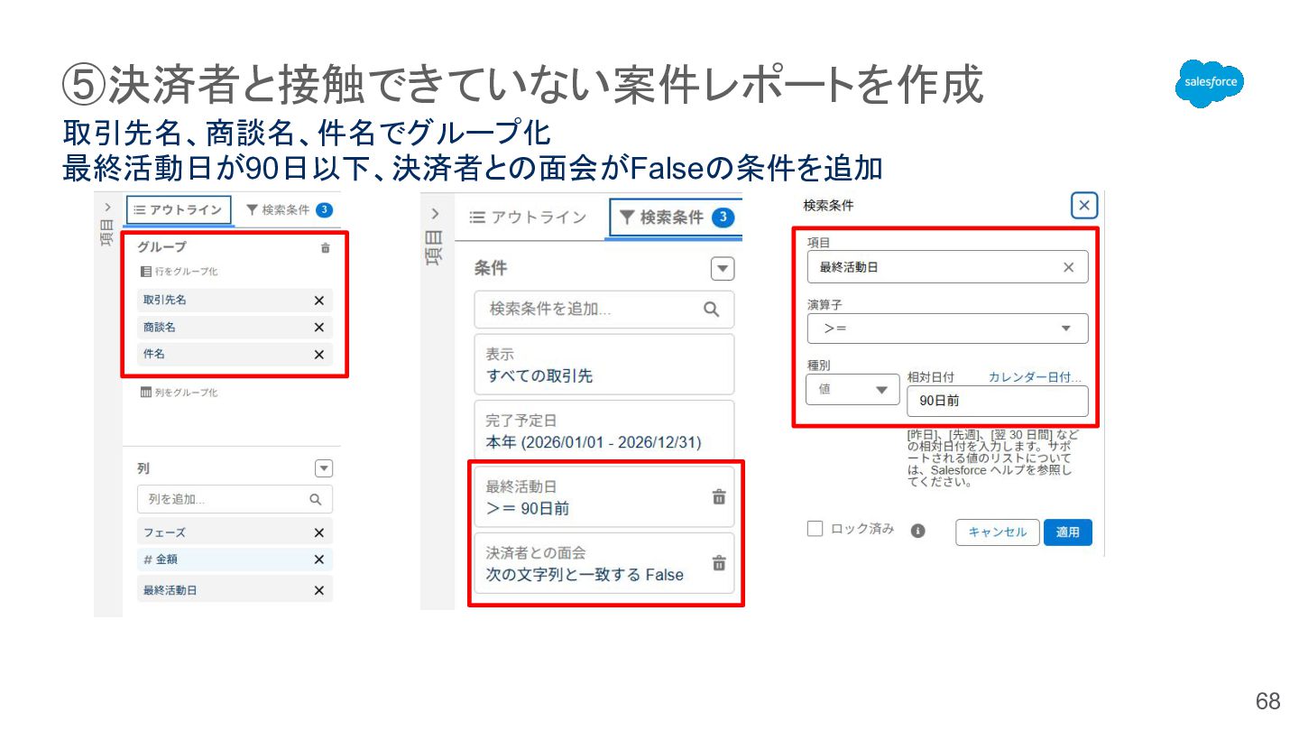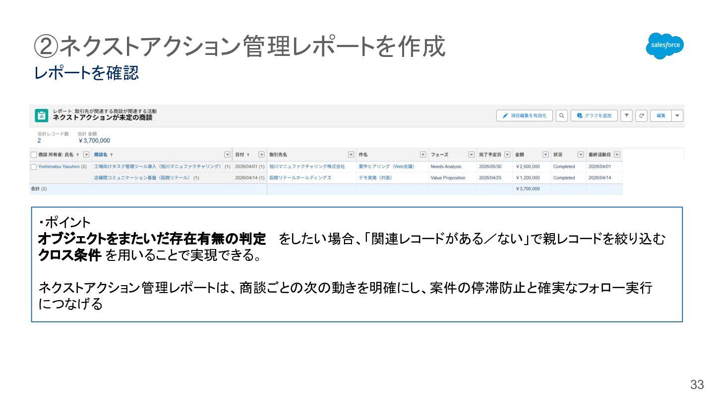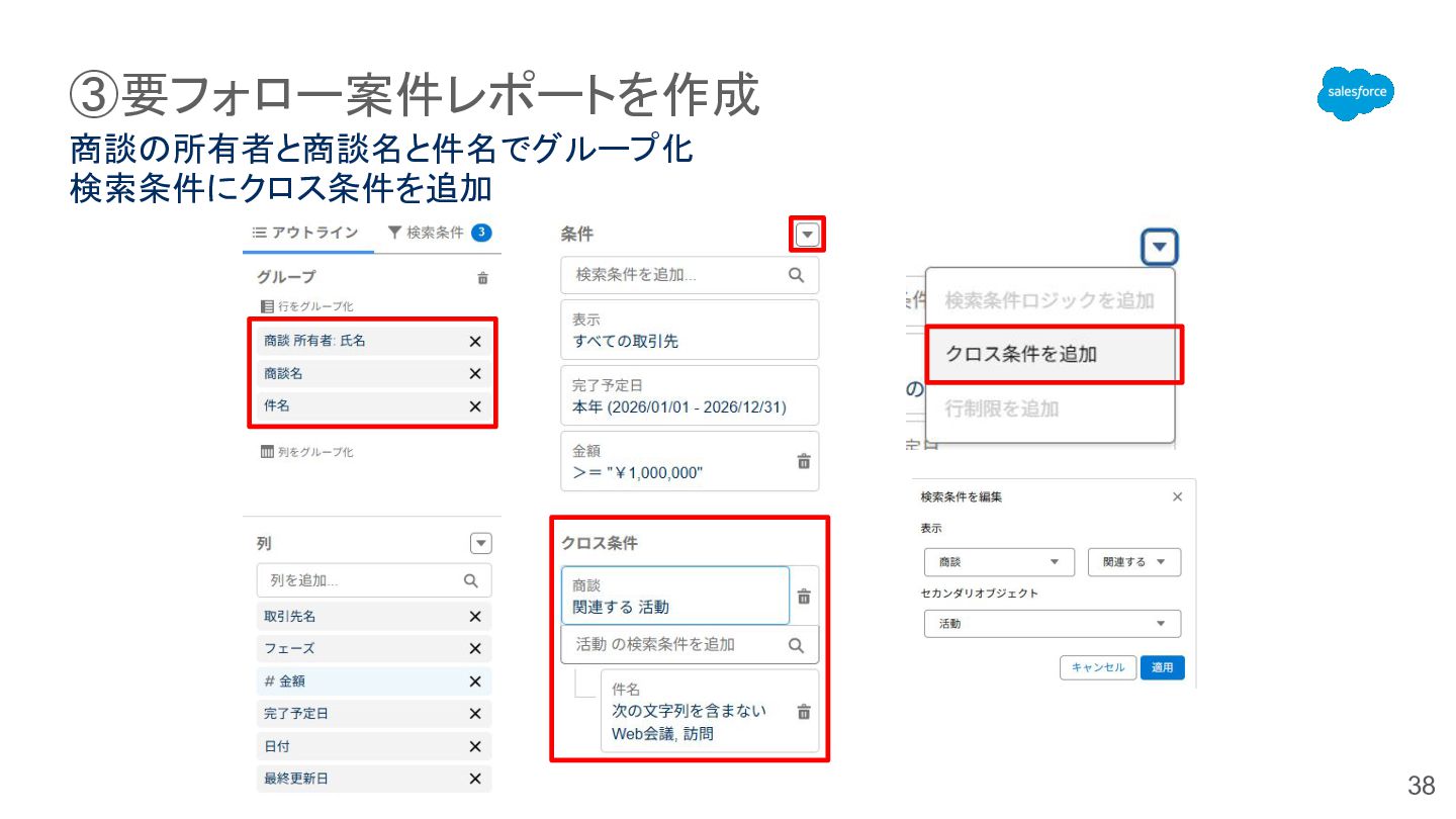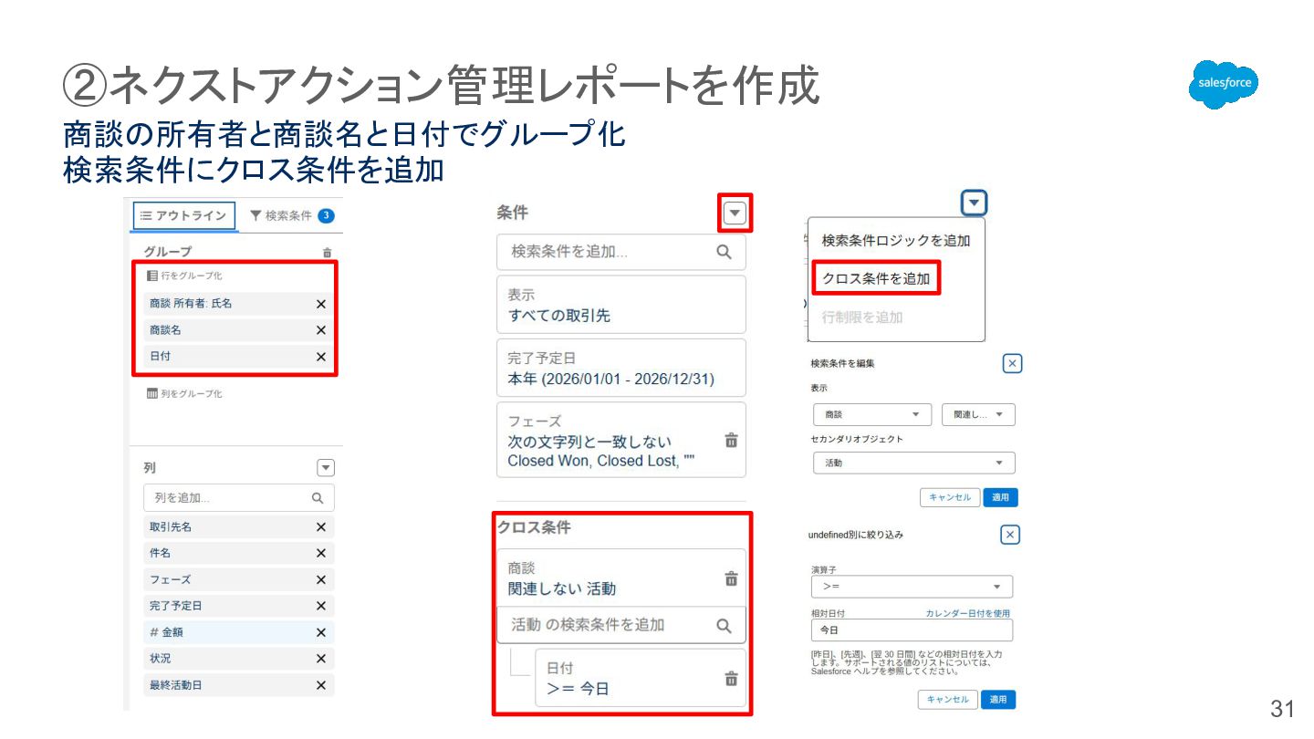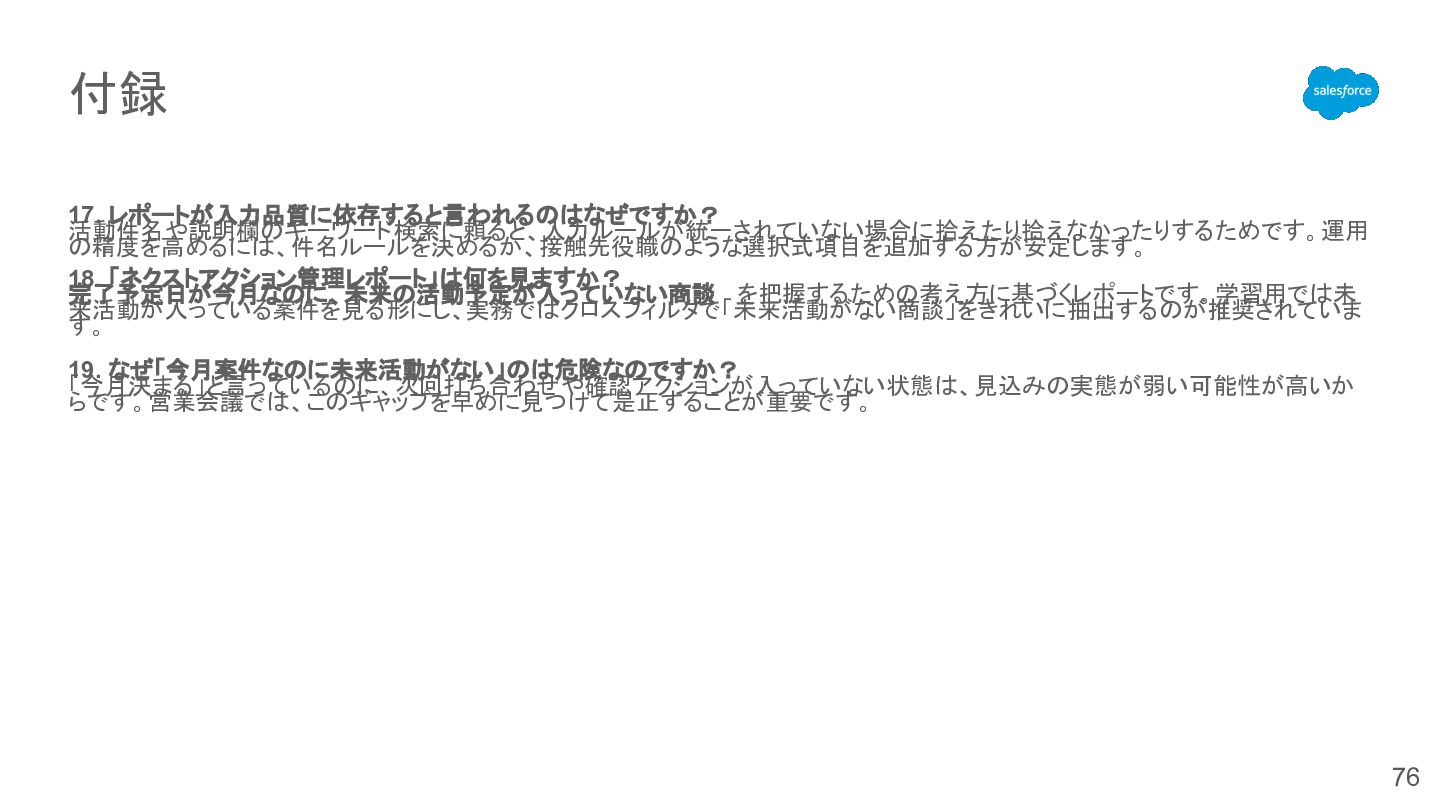 金額が大きい案件ほど、相手との認識合わせ、関係構築、提案の深さが必要になるためです。メールばかりの活動履歴しかない 場合、その案件は見込みほど進んでいない可能性があります。 11. 「Web会議がない案件」を厳密に抽出するにはどうすればいいですか? 学習用としては3階層レポートで活動種別を見せる方法でも十分ですが、実務では商談レポート + クロスフィルタ の方が適してい ます。親レコードである商談に対して、特定の子レコード活動の有無を見たい場合、クロスフィルタの方が自然です。 12. クロスフィルタとは何ですか? 親オブジェクトに対して、関連する子オブジェクトのレコードがある/ない で絞り込む機能です。たとえば「商談 WITHOUT 活動」 「商談 WITH 活動」のように使います。通常の項目フィルタだけでは表現しにくい条件に向いています。 74
