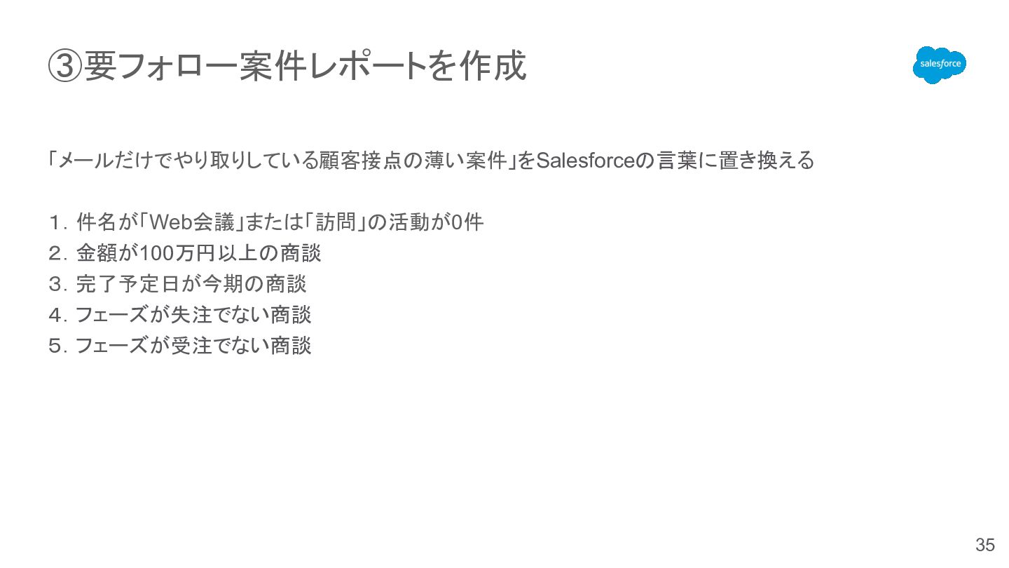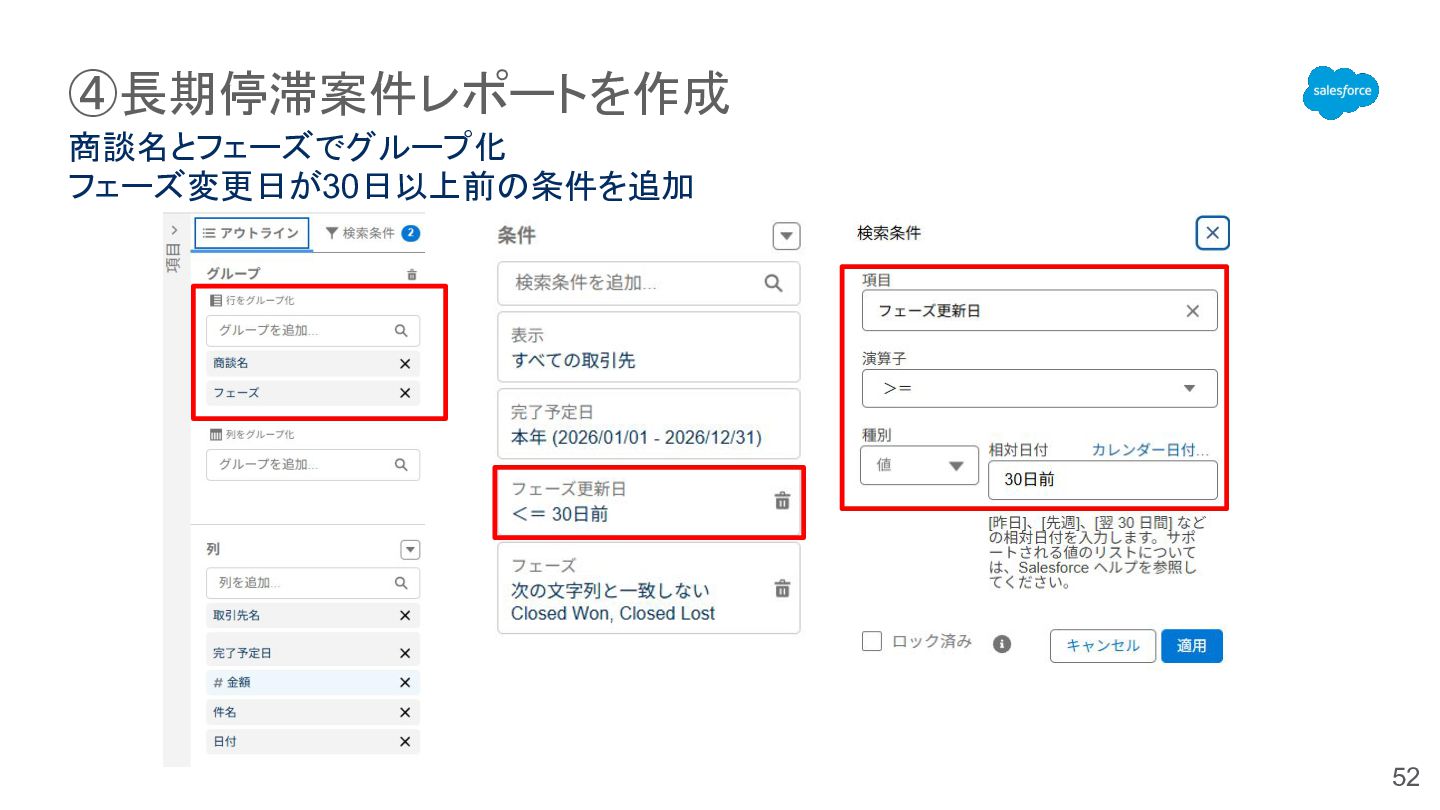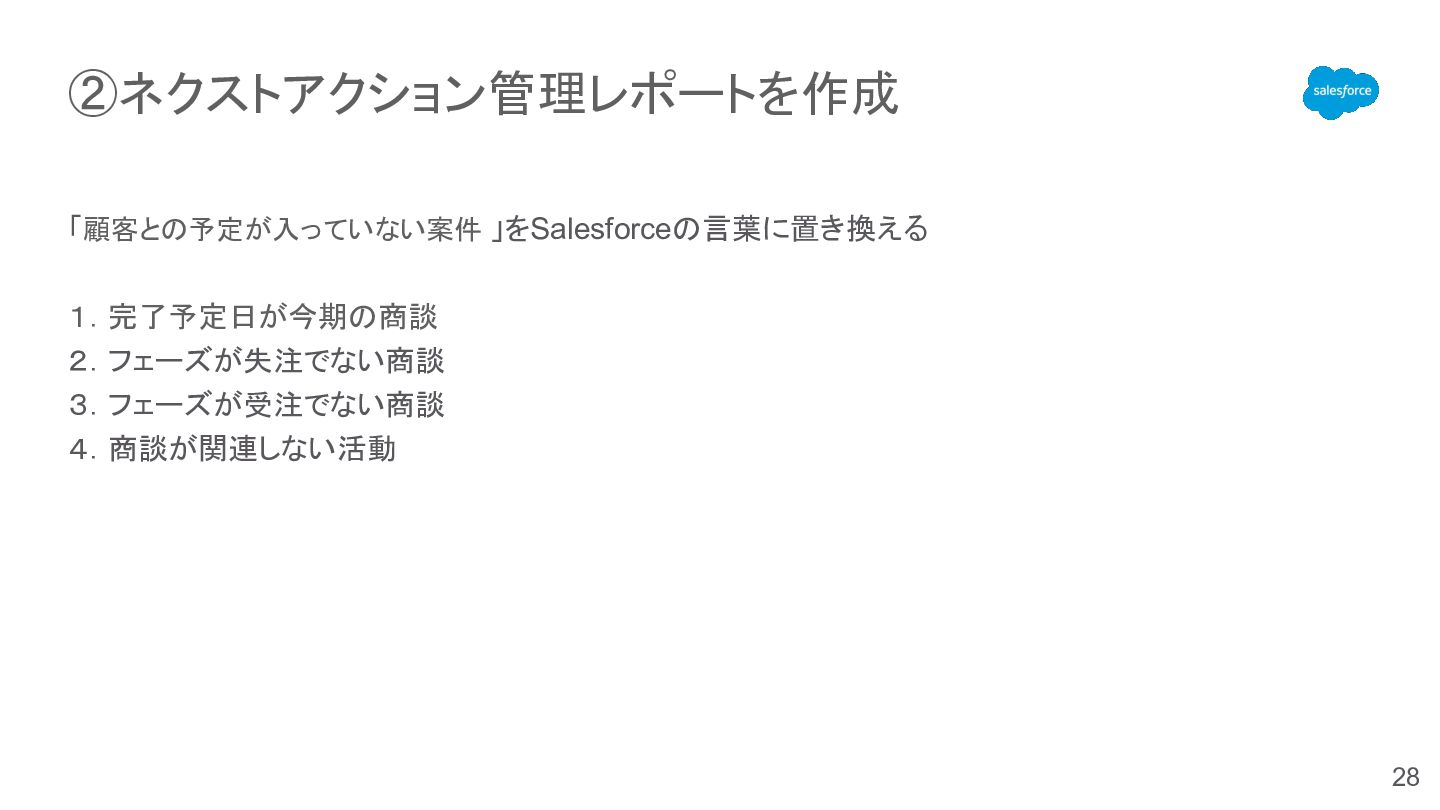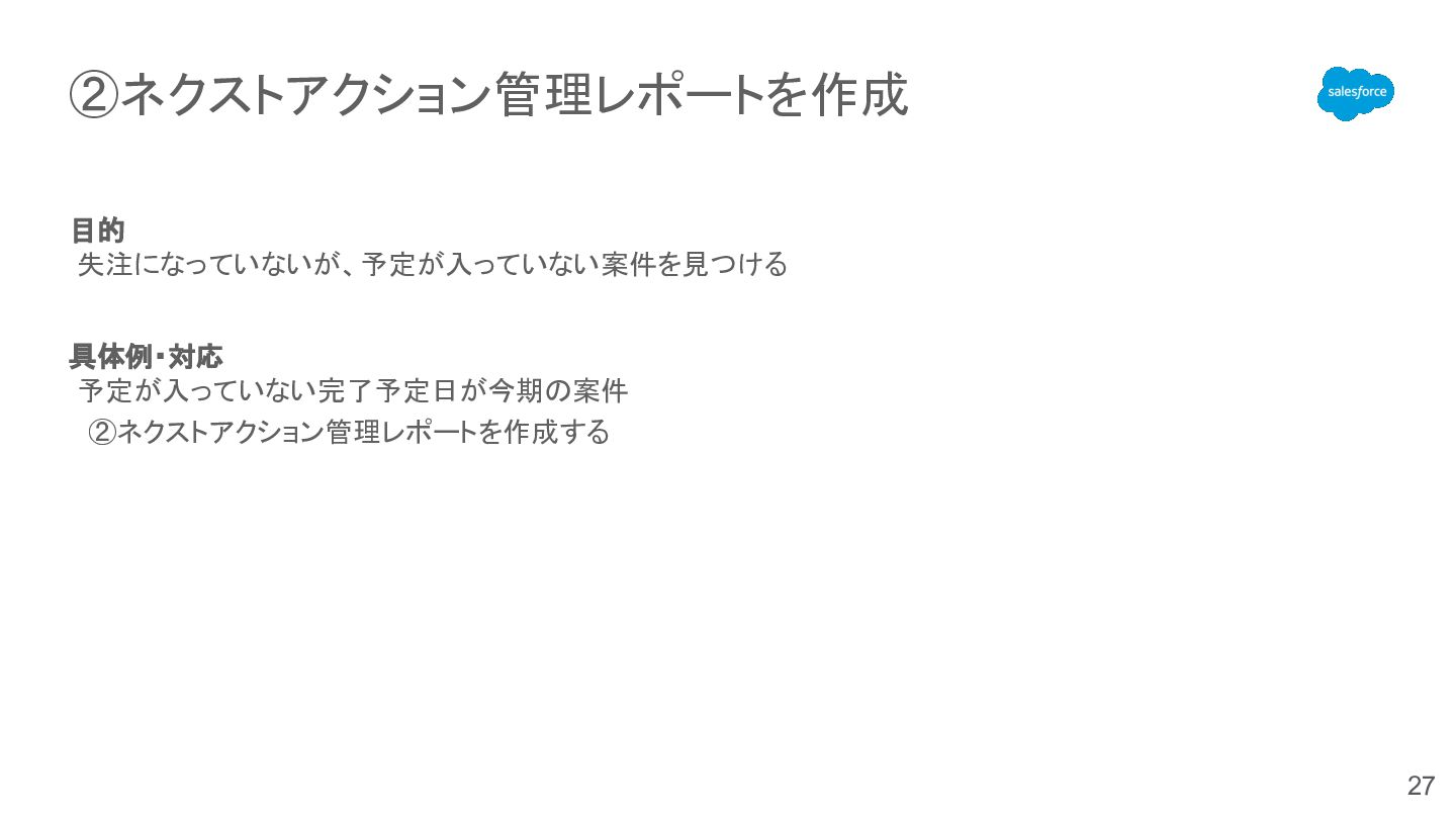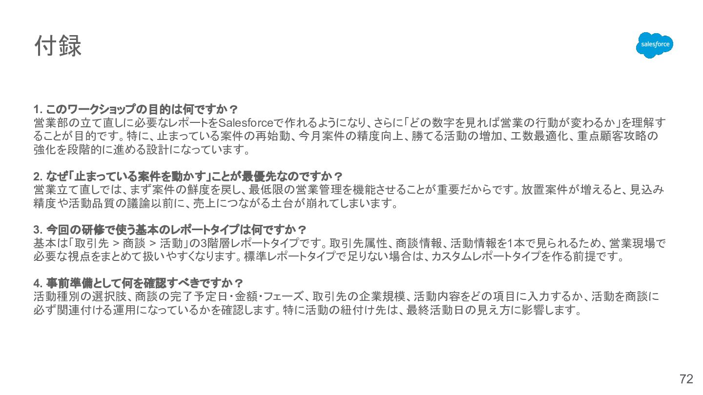 金額が大きい案件ほど、相手との認識合わせ、関係構築、提案の深さが必要になるためです。メールばかりの活動履歴しかない 場合、その案件は見込みほど進んでいない可能性があります。 11. 「Web会議がない案件」を厳密に抽出するにはどうすればいいですか? 学習用としては3階層レポートで活動種別を見せる方法でも十分ですが、実務では商談レポート + クロスフィルタ の方が適してい ます。親レコードである商談に対して、特定の子レコード活動の有無を見たい場合、クロスフィルタの方が自然です。 12. クロスフィルタとは何ですか? 親オブジェクトに対して、関連する子オブジェクトのレコードがある/ない で絞り込む機能です。たとえば「商談 WITHOUT 活動」 「商談 WITH 活動」のように使います。通常の項目フィルタだけでは表現しにくい条件に向いています。 74