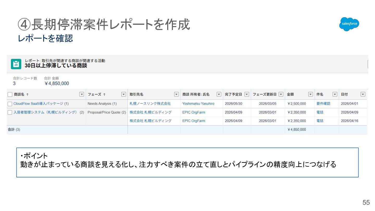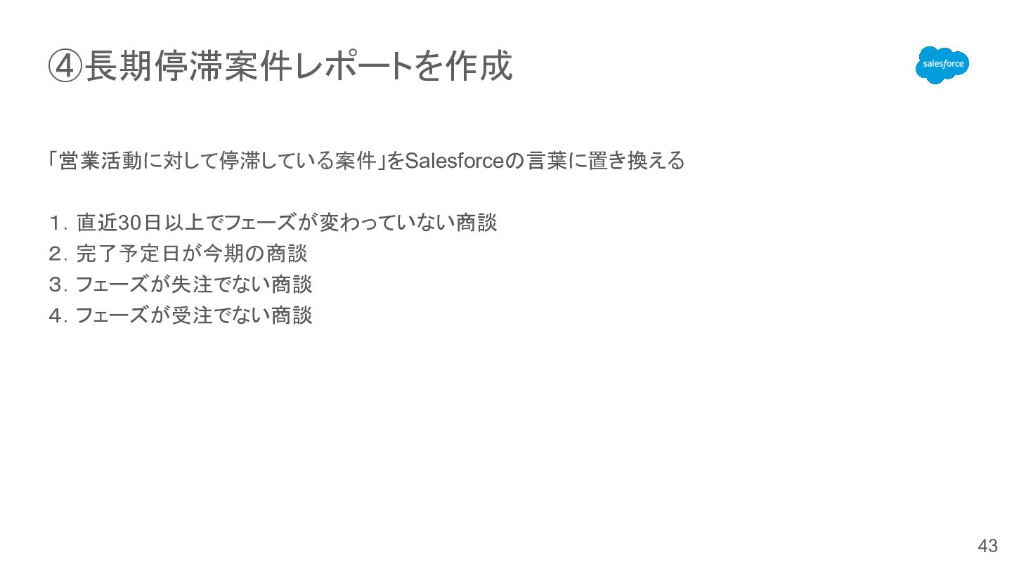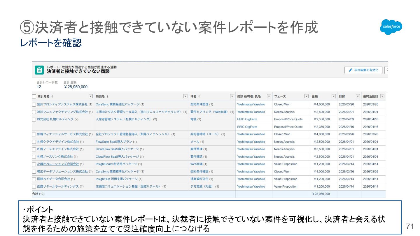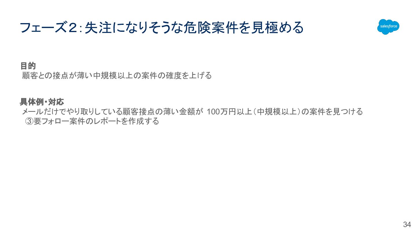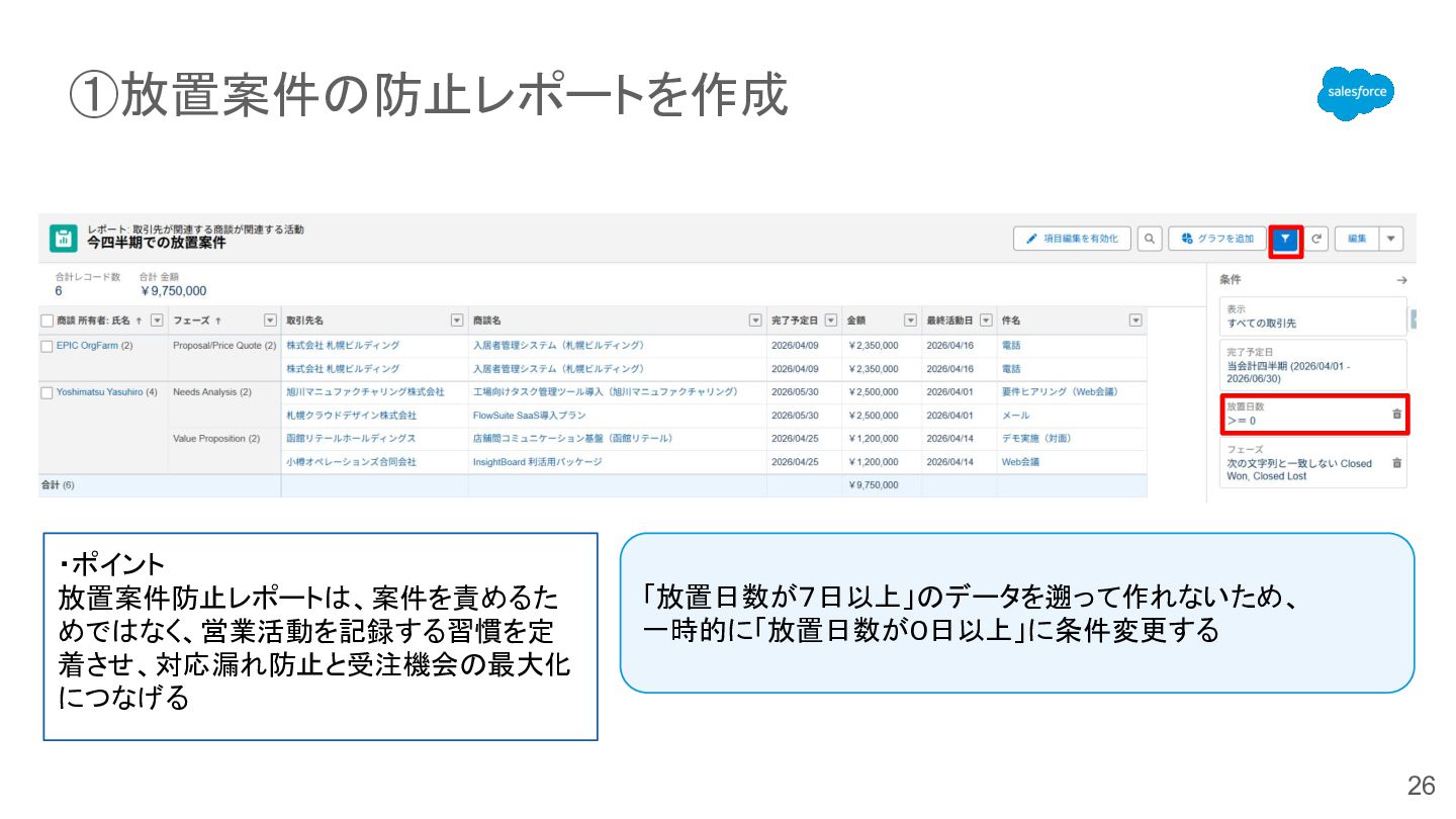 金額が大きい案件ほど、相手との認識合わせ、関係構築、提案の深さが必要になるためです。メールばかりの活動履歴しかない 場合、その案件は見込みほど進んでいない可能性があります。 11. 「Web会議がない案件」を厳密に抽出するにはどうすればいいですか? 学習用としては3階層レポートで活動種別を見せる方法でも十分ですが、実務では商談レポート + クロスフィルタ の方が適してい ます。親レコードである商談に対して、特定の子レコード活動の有無を見たい場合、クロスフィルタの方が自然です。 12. クロスフィルタとは何ですか? 親オブジェクトに対して、関連する子オブジェクトのレコードがある/ない で絞り込む機能です。たとえば「商談 WITHOUT 活動」 「商談 WITH 活動」のように使います。通常の項目フィルタだけでは表現しにくい条件に向いています。 74