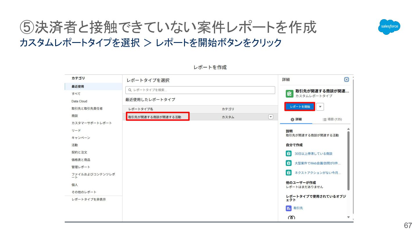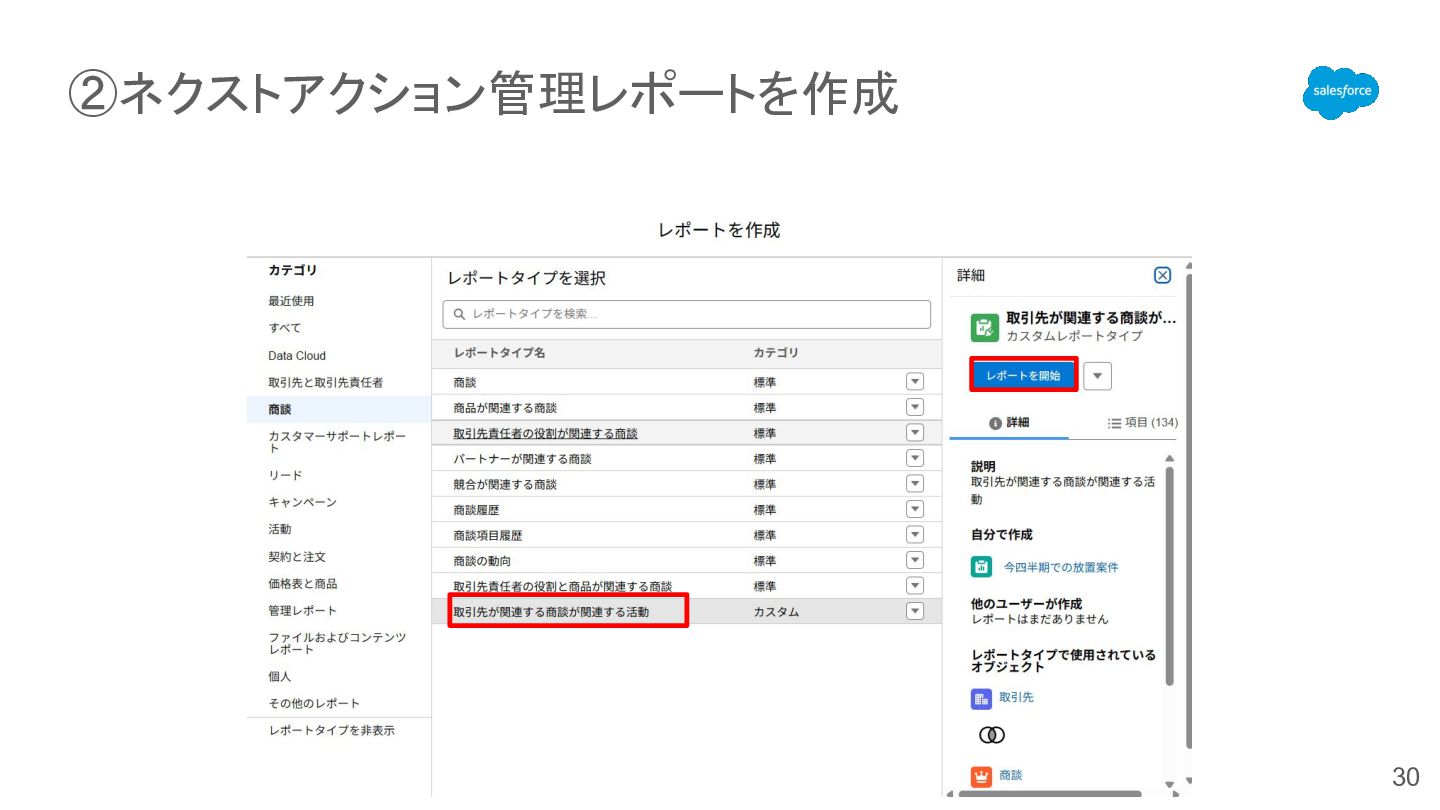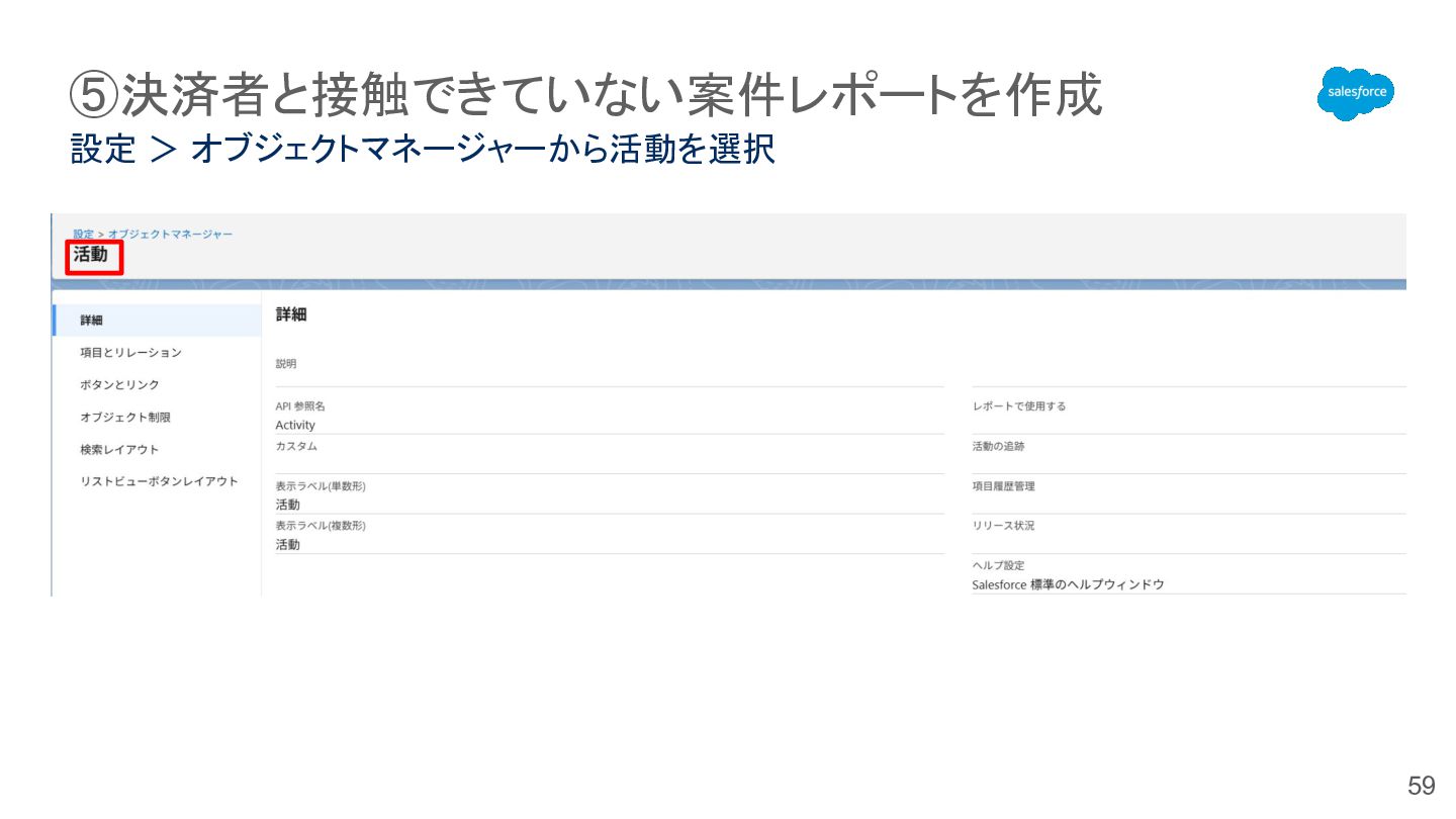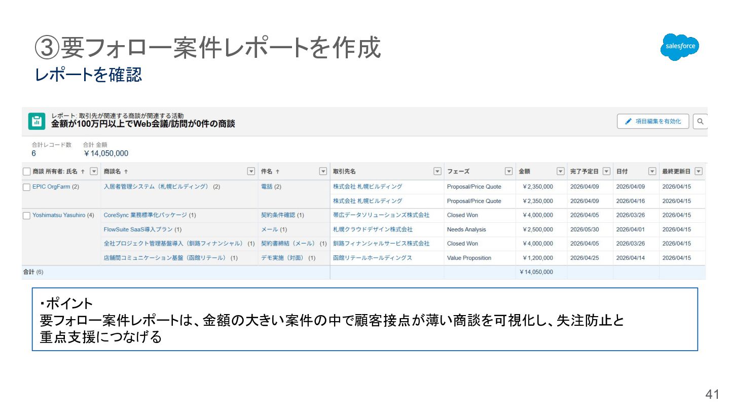 金額が大きい案件ほど、相手との認識合わせ、関係構築、提案の深さが必要になるためです。メールばかりの活動履歴しかない 場合、その案件は見込みほど進んでいない可能性があります。 11. 「Web会議がない案件」を厳密に抽出するにはどうすればいいですか? 学習用としては3階層レポートで活動種別を見せる方法でも十分ですが、実務では商談レポート + クロスフィルタ の方が適してい ます。親レコードである商談に対して、特定の子レコード活動の有無を見たい場合、クロスフィルタの方が自然です。 12. クロスフィルタとは何ですか? 親オブジェクトに対して、関連する子オブジェクトのレコードがある/ない で絞り込む機能です。たとえば「商談 WITHOUT 活動」 「商談 WITH 活動」のように使います。通常の項目フィルタだけでは表現しにくい条件に向いています。 74