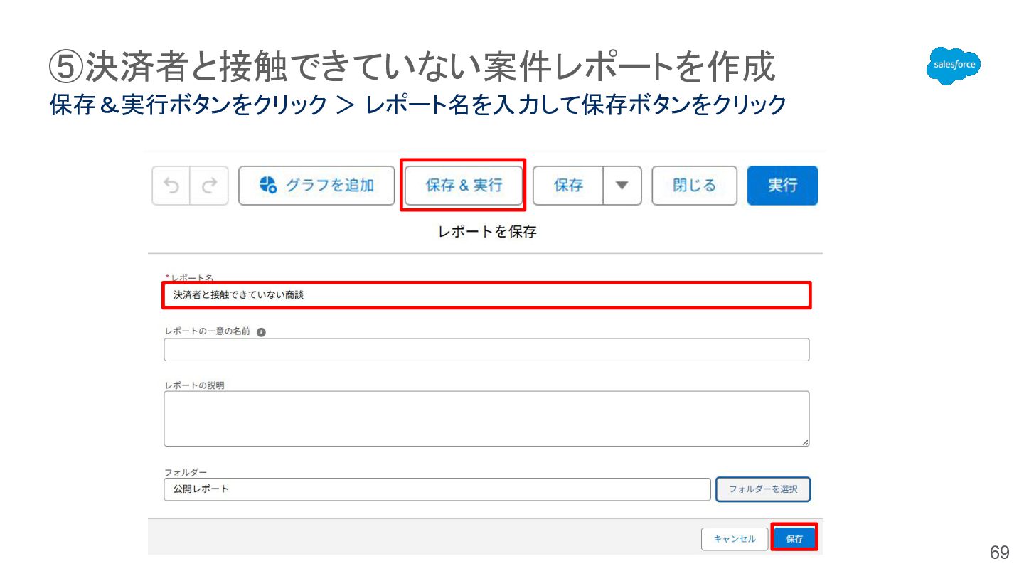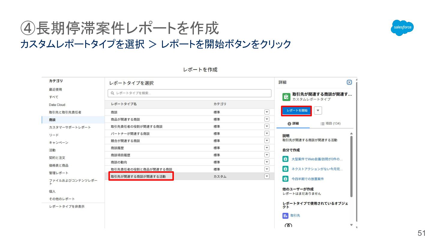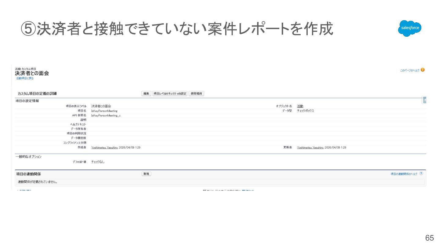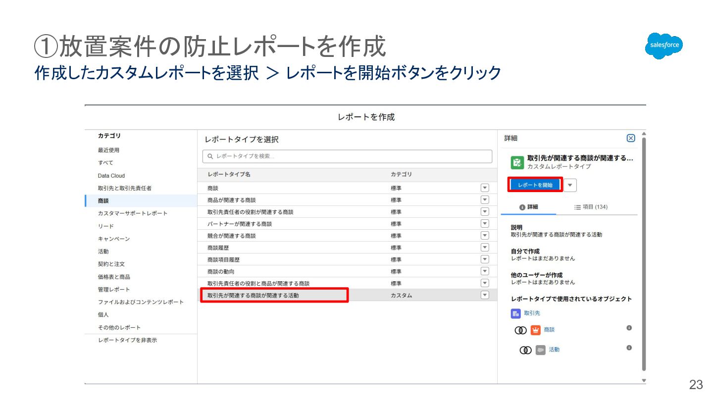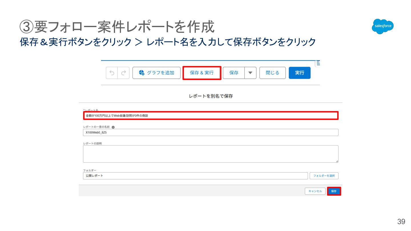 金額が大きい案件ほど、相手との認識合わせ、関係構築、提案の深さが必要になるためです。メールばかりの活動履歴しかない 場合、その案件は見込みほど進んでいない可能性があります。 11. 「Web会議がない案件」を厳密に抽出するにはどうすればいいですか? 学習用としては3階層レポートで活動種別を見せる方法でも十分ですが、実務では商談レポート + クロスフィルタ の方が適してい ます。親レコードである商談に対して、特定の子レコード活動の有無を見たい場合、クロスフィルタの方が自然です。 12. クロスフィルタとは何ですか? 親オブジェクトに対して、関連する子オブジェクトのレコードがある/ない で絞り込む機能です。たとえば「商談 WITHOUT 活動」 「商談 WITH 活動」のように使います。通常の項目フィルタだけでは表現しにくい条件に向いています。 74