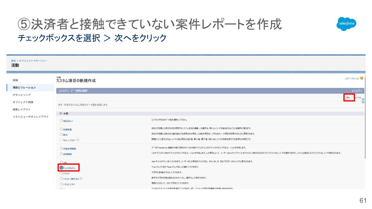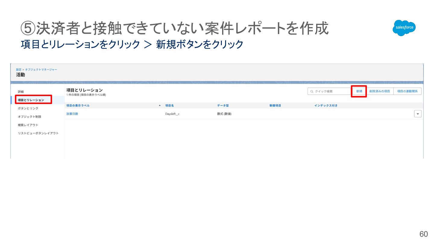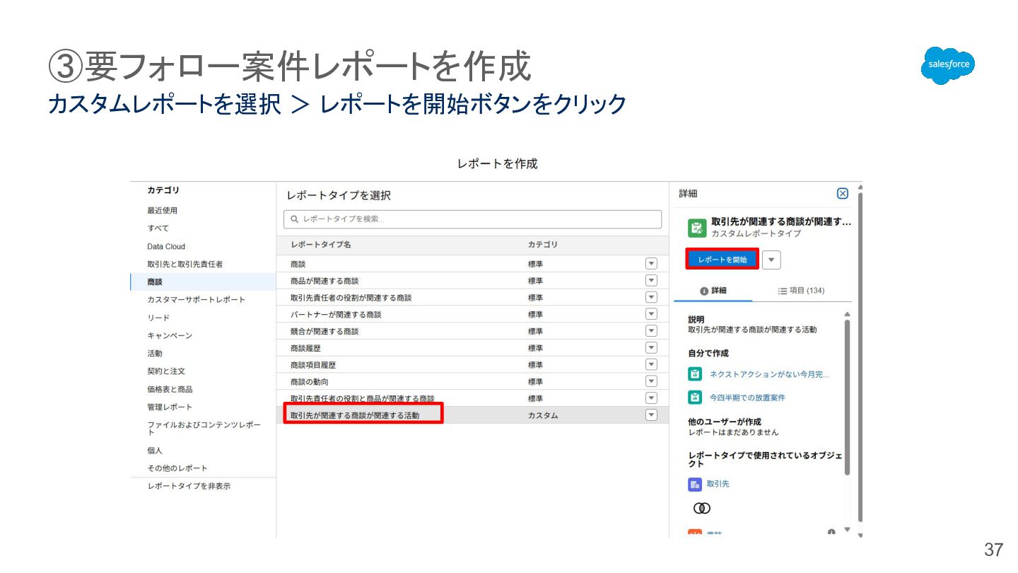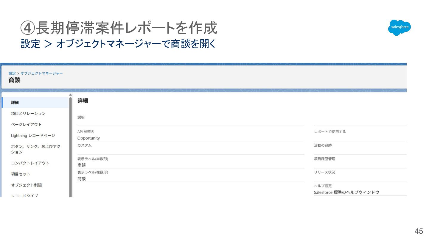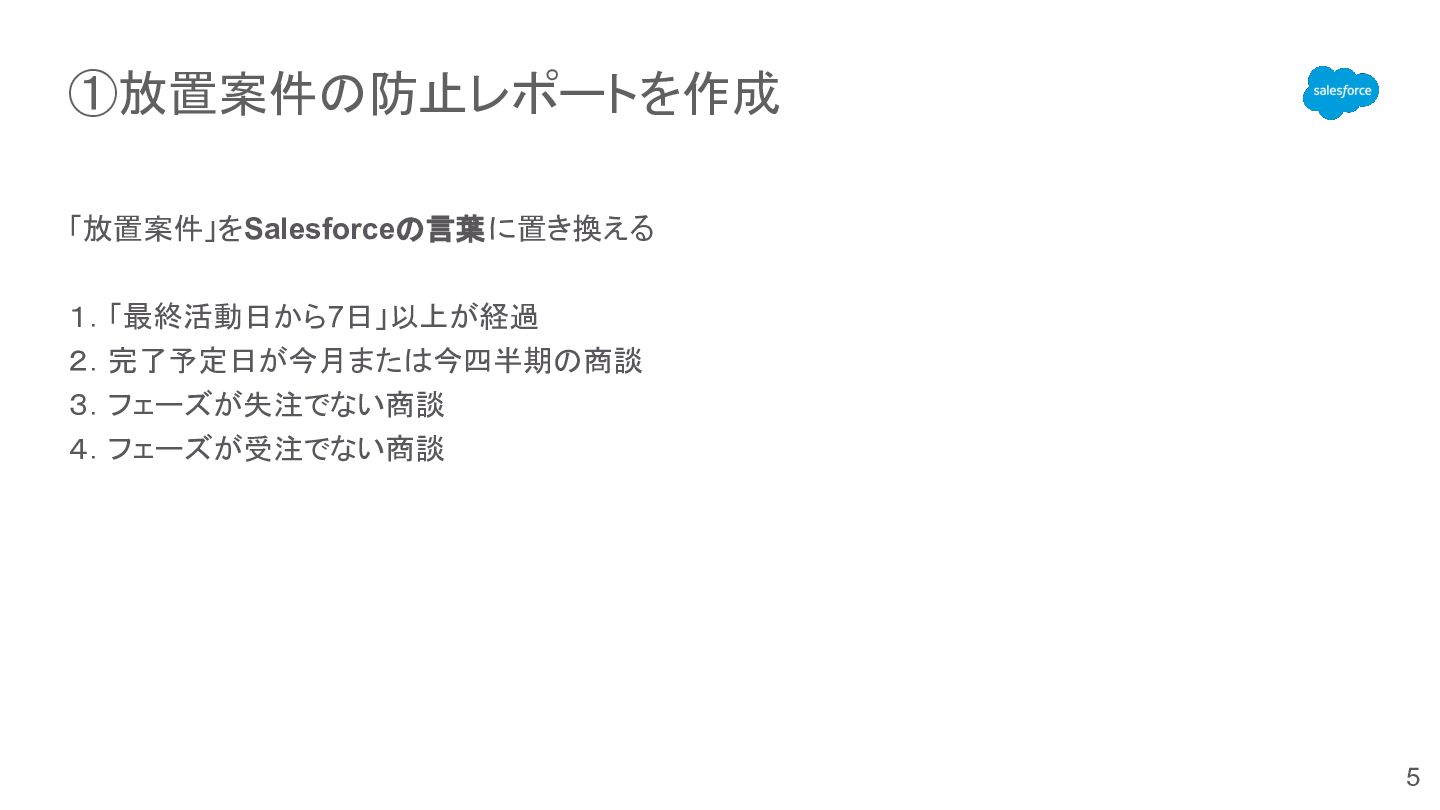 金額が大きい案件ほど、相手との認識合わせ、関係構築、提案の深さが必要になるためです。メールばかりの活動履歴しかない 場合、その案件は見込みほど進んでいない可能性があります。 11. 「Web会議がない案件」を厳密に抽出するにはどうすればいいですか? 学習用としては3階層レポートで活動種別を見せる方法でも十分ですが、実務では商談レポート + クロスフィルタ の方が適してい ます。親レコードである商談に対して、特定の子レコード活動の有無を見たい場合、クロスフィルタの方が自然です。 12. クロスフィルタとは何ですか? 親オブジェクトに対して、関連する子オブジェクトのレコードがある/ない で絞り込む機能です。たとえば「商談 WITHOUT 活動」 「商談 WITH 活動」のように使います。通常の項目フィルタだけでは表現しにくい条件に向いています。 74