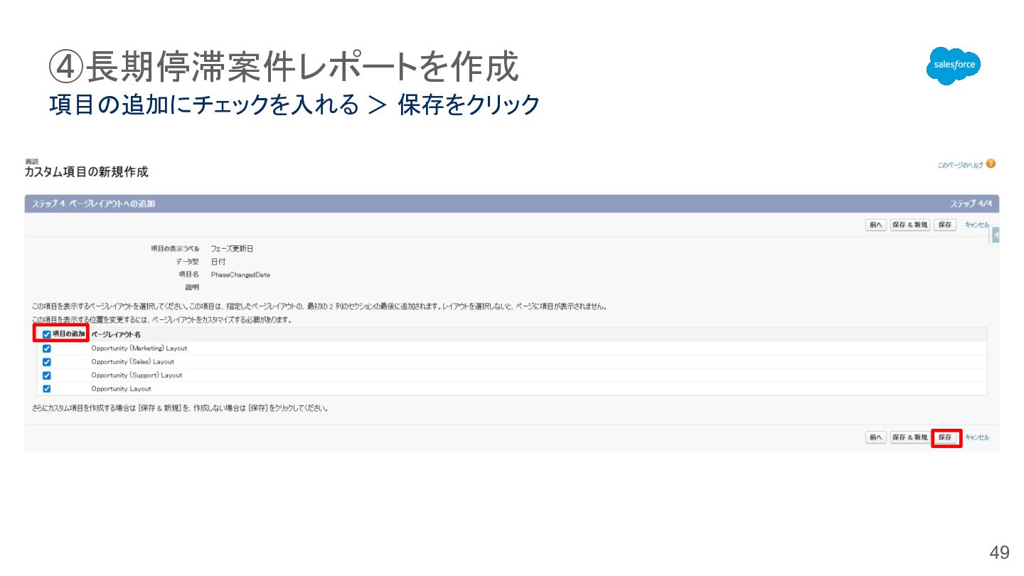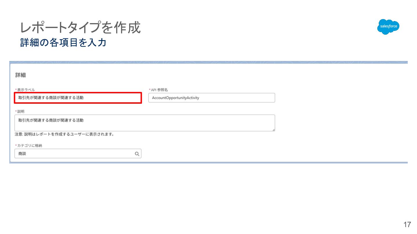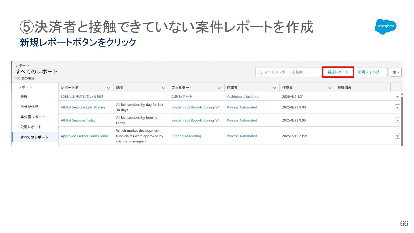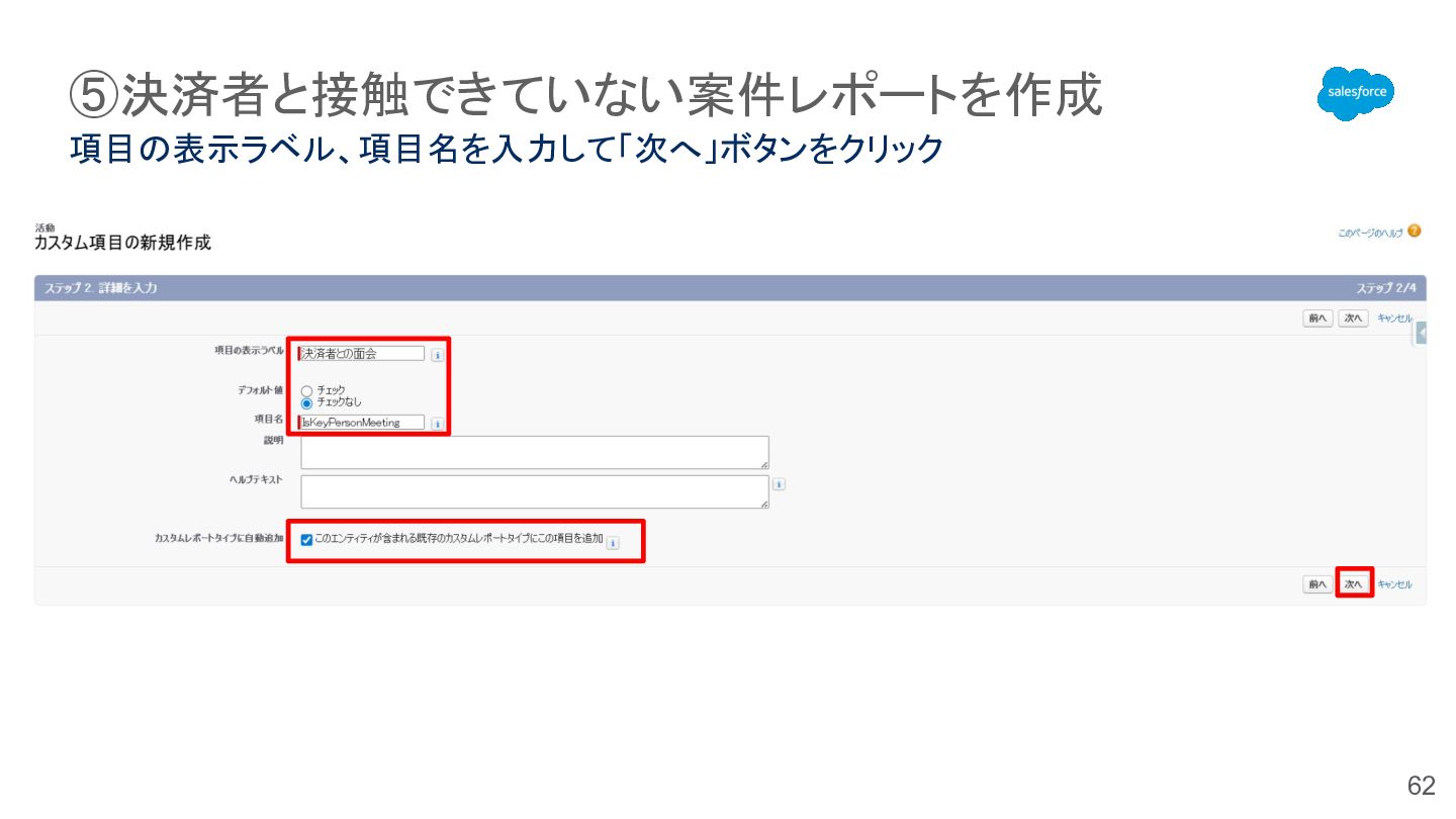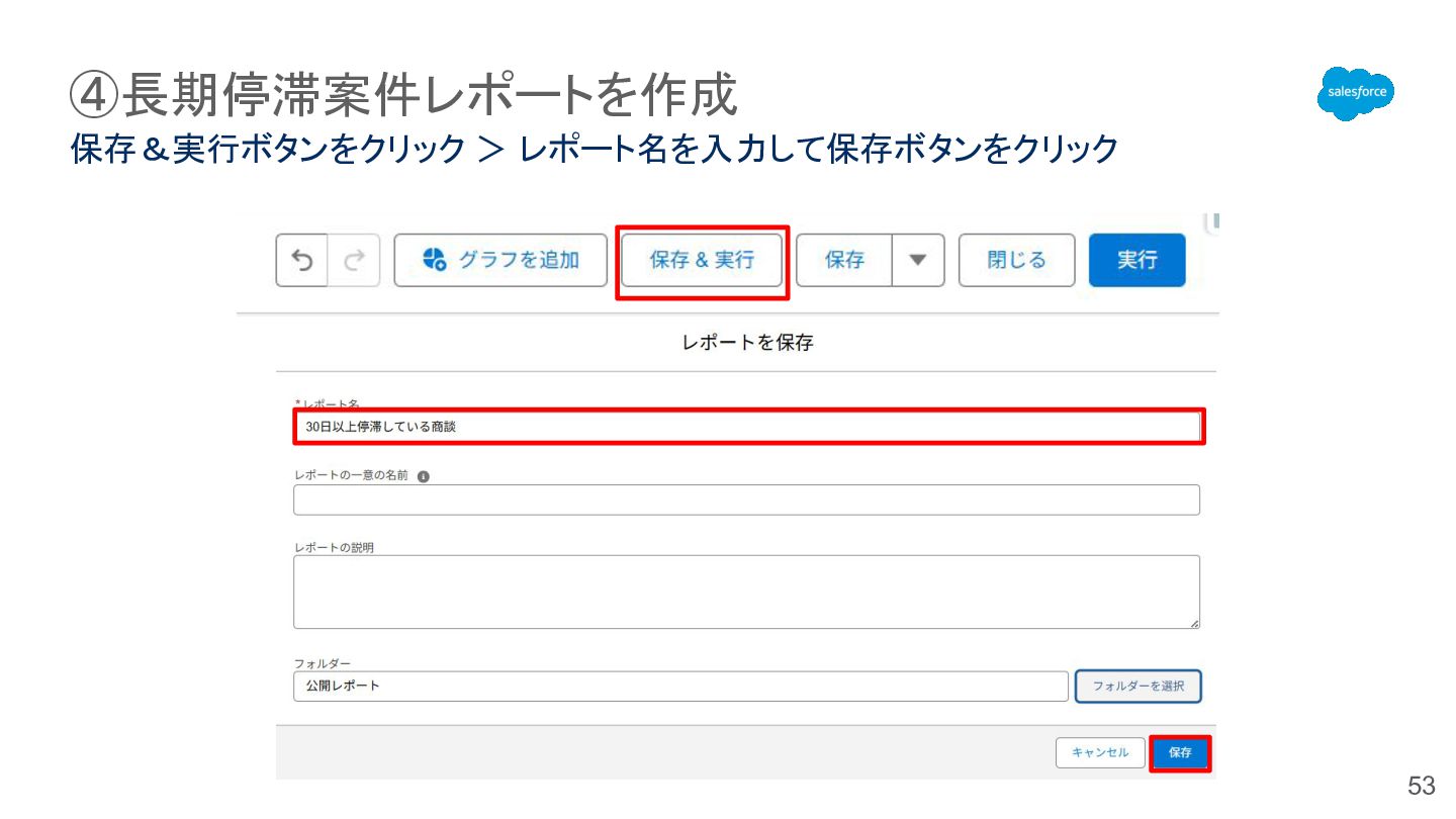 金額が大きい案件ほど、相手との認識合わせ、関係構築、提案の深さが必要になるためです。メールばかりの活動履歴しかない 場合、その案件は見込みほど進んでいない可能性があります。 11. 「Web会議がない案件」を厳密に抽出するにはどうすればいいですか? 学習用としては3階層レポートで活動種別を見せる方法でも十分ですが、実務では商談レポート + クロスフィルタ の方が適してい ます。親レコードである商談に対して、特定の子レコード活動の有無を見たい場合、クロスフィルタの方が自然です。 12. クロスフィルタとは何ですか? 親オブジェクトに対して、関連する子オブジェクトのレコードがある/ない で絞り込む機能です。たとえば「商談 WITHOUT 活動」 「商談 WITH 活動」のように使います。通常の項目フィルタだけでは表現しにくい条件に向いています。 74