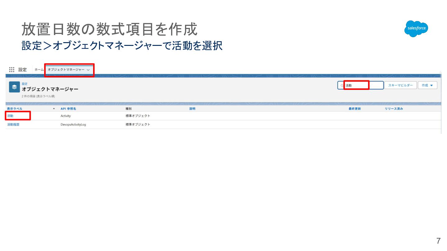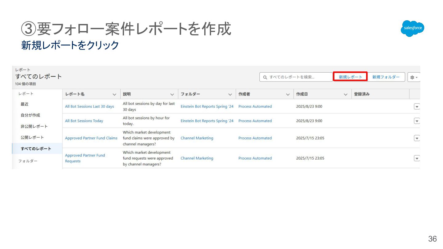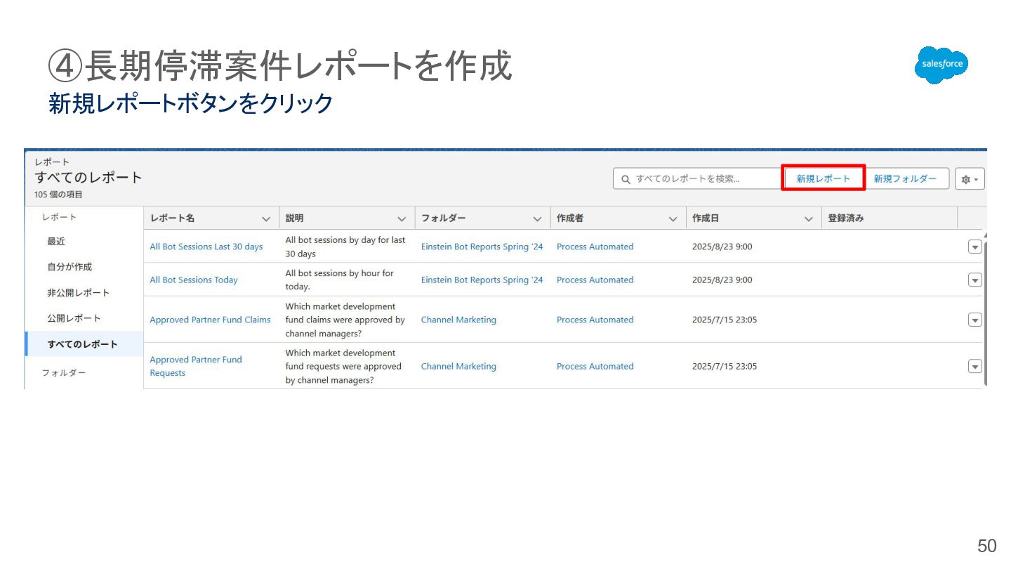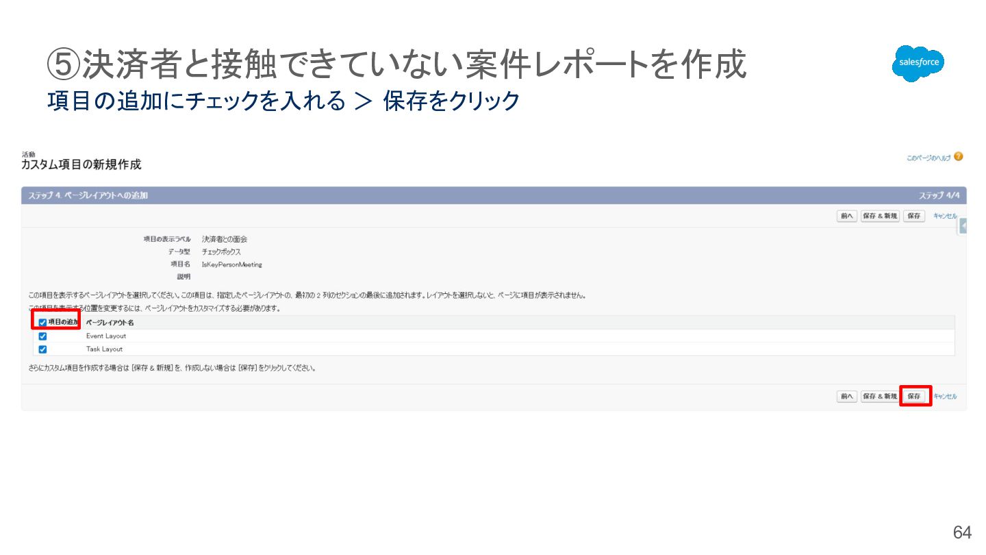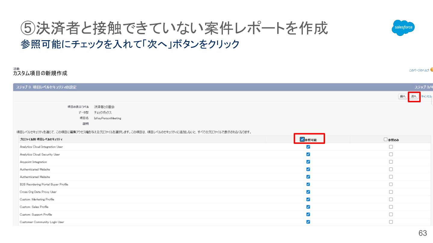 金額が大きい案件ほど、相手との認識合わせ、関係構築、提案の深さが必要になるためです。メールばかりの活動履歴しかない 場合、その案件は見込みほど進んでいない可能性があります。 11. 「Web会議がない案件」を厳密に抽出するにはどうすればいいですか? 学習用としては3階層レポートで活動種別を見せる方法でも十分ですが、実務では商談レポート + クロスフィルタ の方が適してい ます。親レコードである商談に対して、特定の子レコード活動の有無を見たい場合、クロスフィルタの方が自然です。 12. クロスフィルタとは何ですか? 親オブジェクトに対して、関連する子オブジェクトのレコードがある/ない で絞り込む機能です。たとえば「商談 WITHOUT 活動」 「商談 WITH 活動」のように使います。通常の項目フィルタだけでは表現しにくい条件に向いています。 74