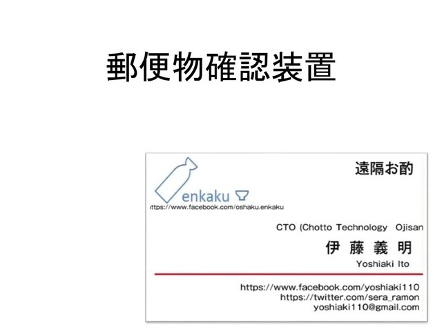仕様・通知方法 • 家の前についたら、携帯が知らせる – 投入されたとき通知ではダメ、家に帰るまでに忘 れちゃう • 携帯でなく、ボードが光るのもOK、但し他人 の時は光らないこと
