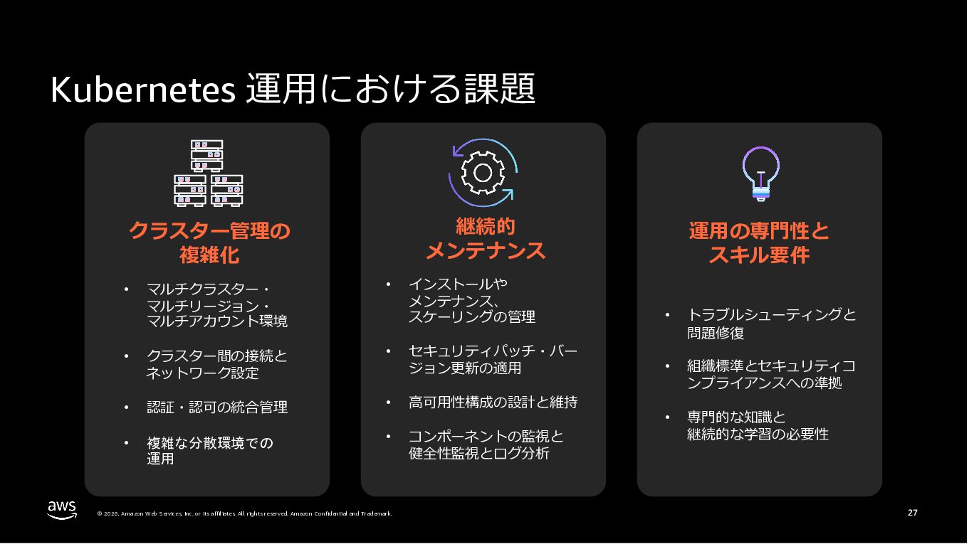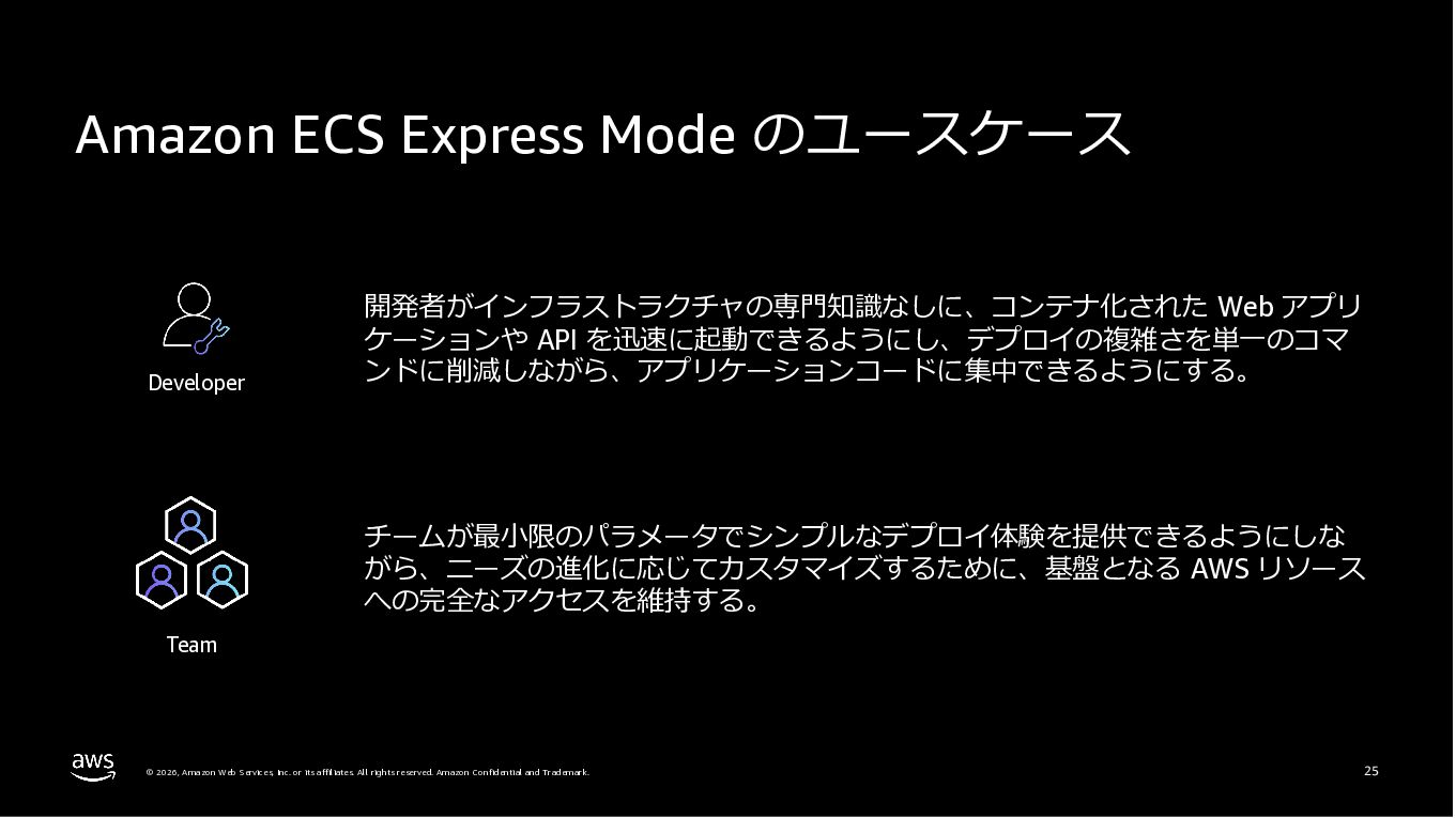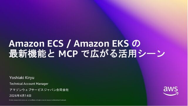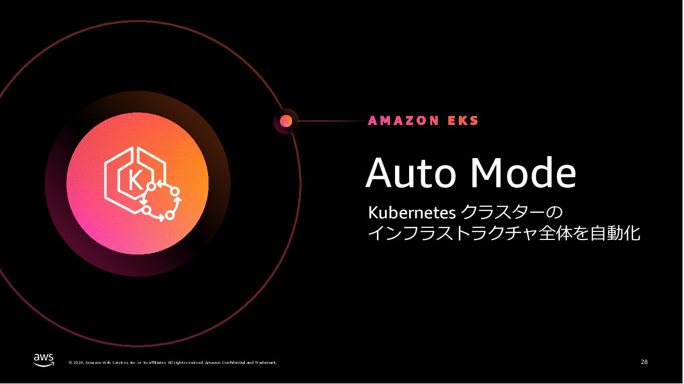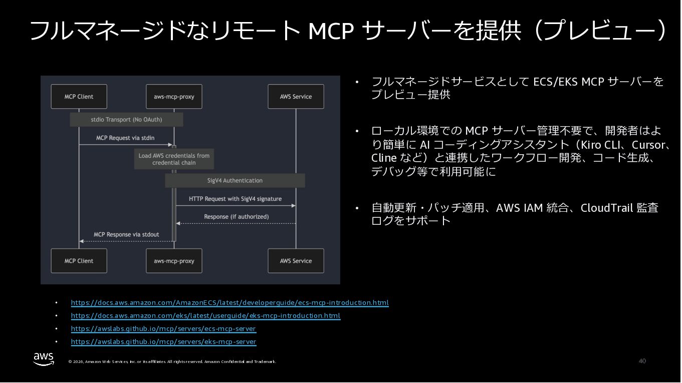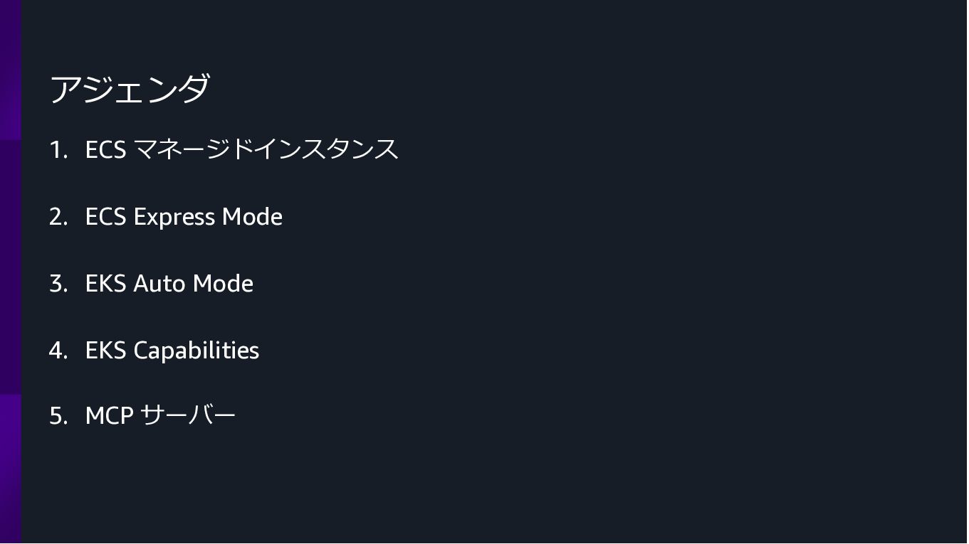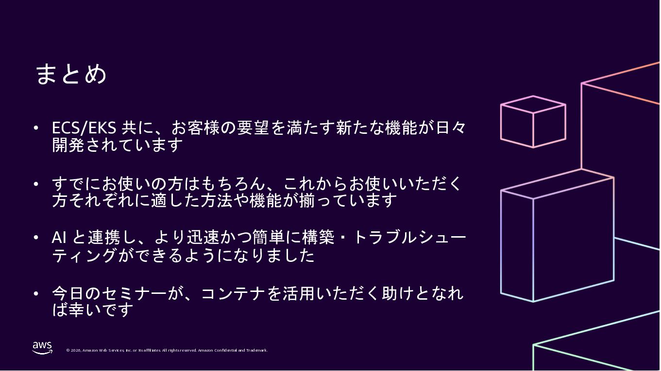 Amazon ECS と Amazon EKS の最新機能、そして MCP(Model Context Protocol)サーバーとの連携による新たな活用シーンについて解説しました。ECS Managed Instances では Fargate と EC2 の利点を組み合わせた第3の選択肢が提供され、GPU インスタンスや大容量メモリへの対応、AWS による自動的なインフラ管理と最適化を実現しています。また、ECS Express Mode ではコンテナイメージと IAM ロールのみでベストプラクティスに基づいた本番環境を即座に構築でき、EKS Auto Mode では Kubernetes クラスター全体のインフラ管理が自動化されることで運用負荷を大幅に軽減します。さらに、フルマネージド型の MCP サーバーにより、AI コーディングアシスタントとの連携を通じて開発効率の向上とトラブルシューティングの迅速化が可能となりました。