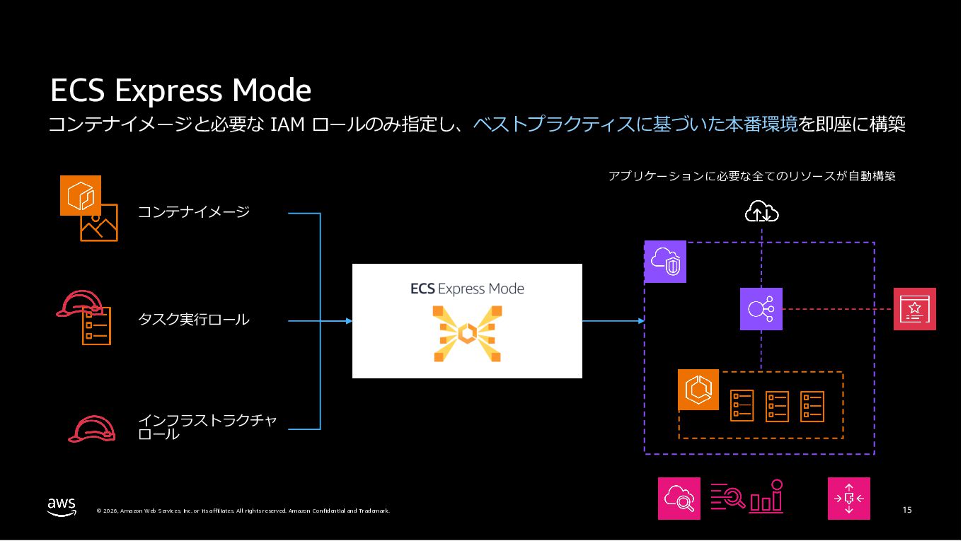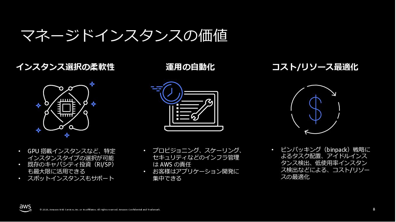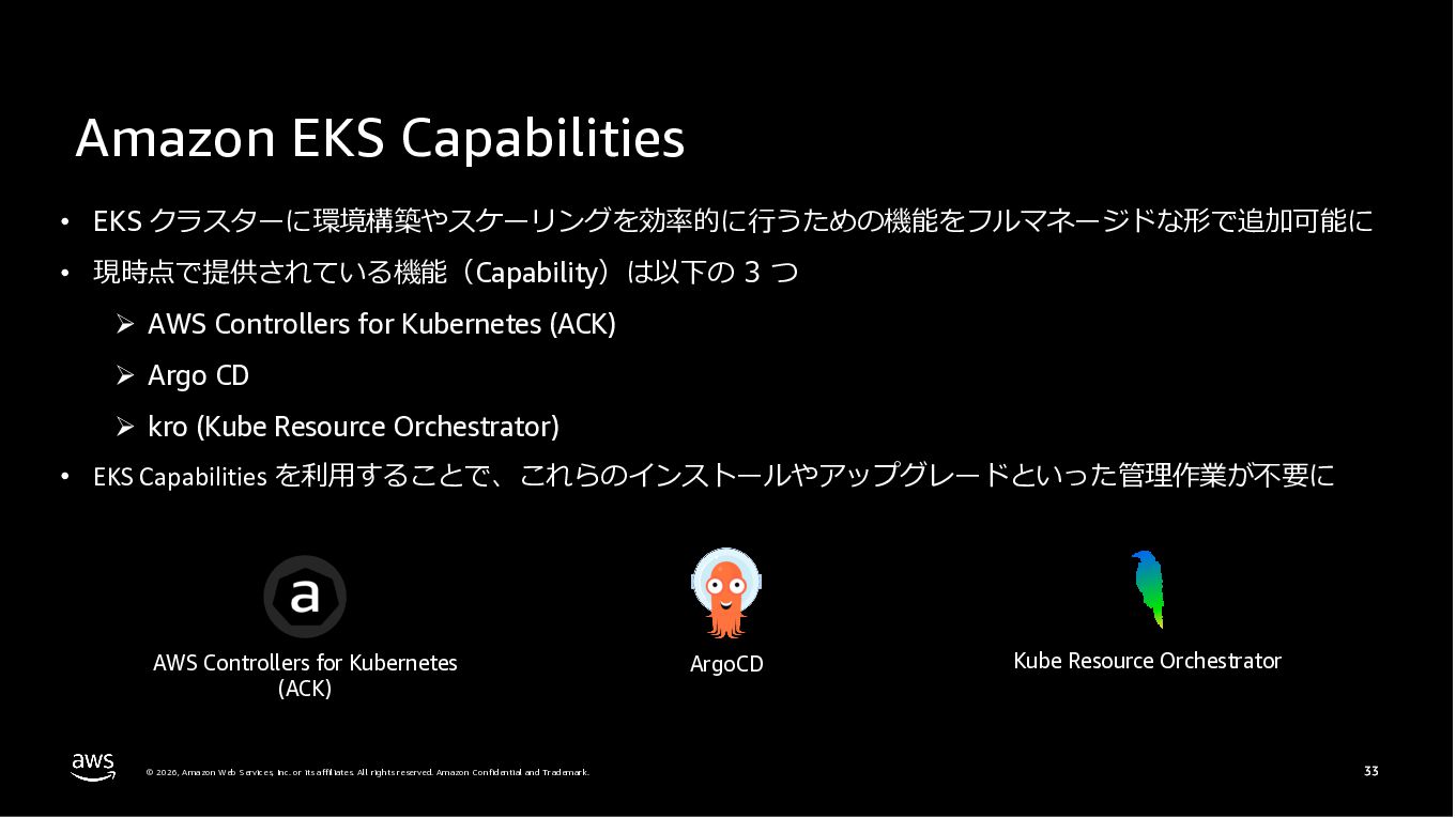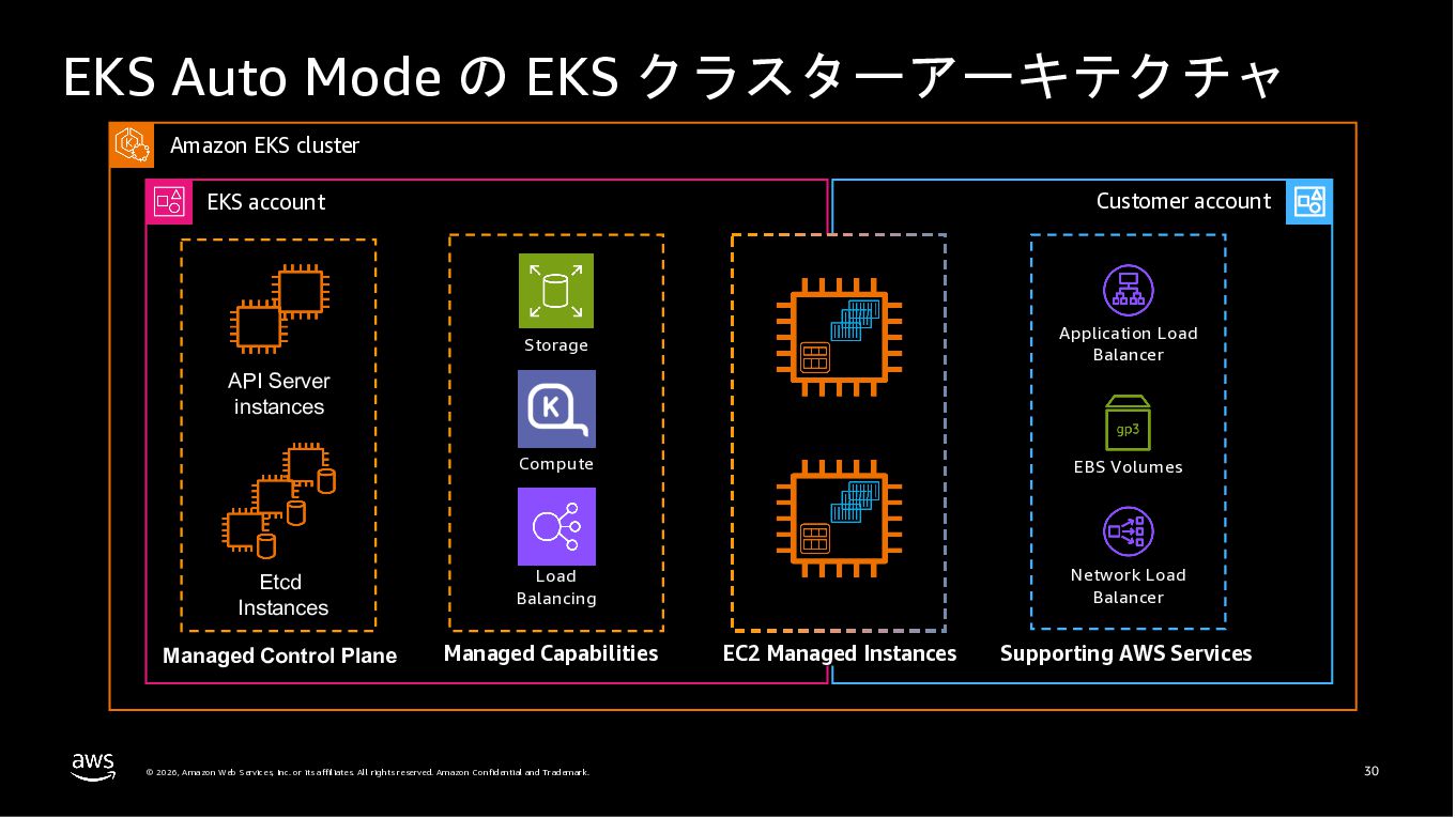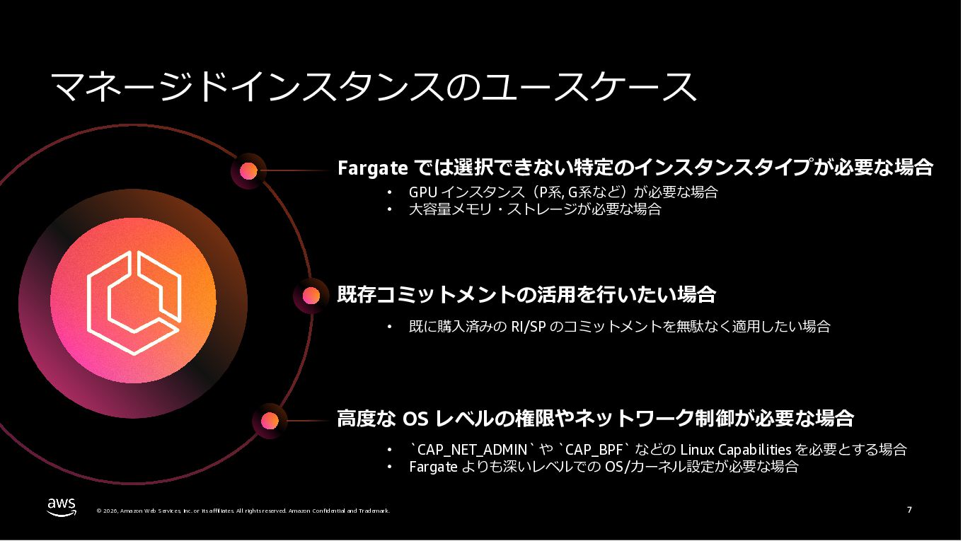 Amazon ECS と Amazon EKS の最新機能、そして MCP(Model Context Protocol)サーバーとの連携による新たな活用シーンについて解説しました。ECS Managed Instances では Fargate と EC2 の利点を組み合わせた第3の選択肢が提供され、GPU インスタンスや大容量メモリへの対応、AWS による自動的なインフラ管理と最適化を実現しています。また、ECS Express Mode ではコンテナイメージと IAM ロールのみでベストプラクティスに基づいた本番環境を即座に構築でき、EKS Auto Mode では Kubernetes クラスター全体のインフラ管理が自動化されることで運用負荷を大幅に軽減します。さらに、フルマネージド型の MCP サーバーにより、AI コーディングアシスタントとの連携を通じて開発効率の向上とトラブルシューティングの迅速化が可能となりました。
