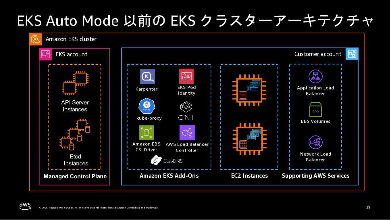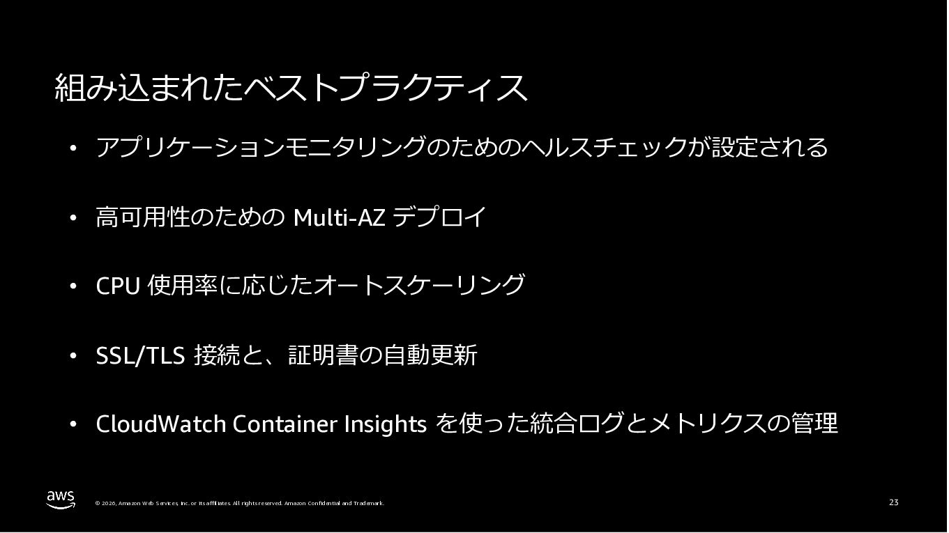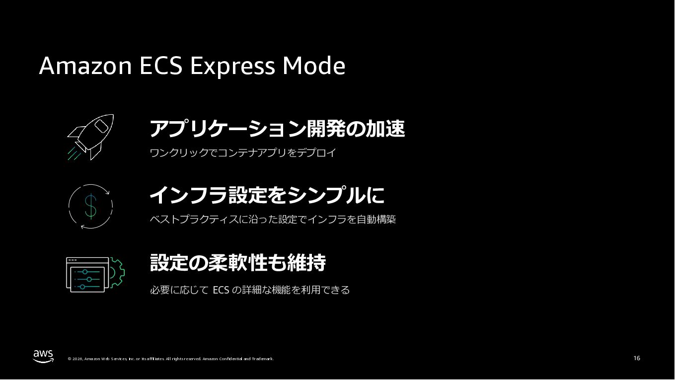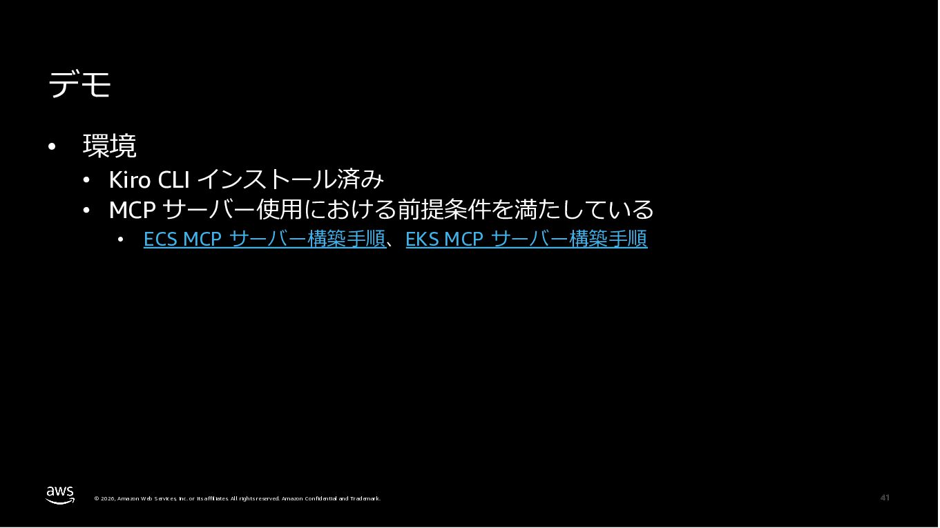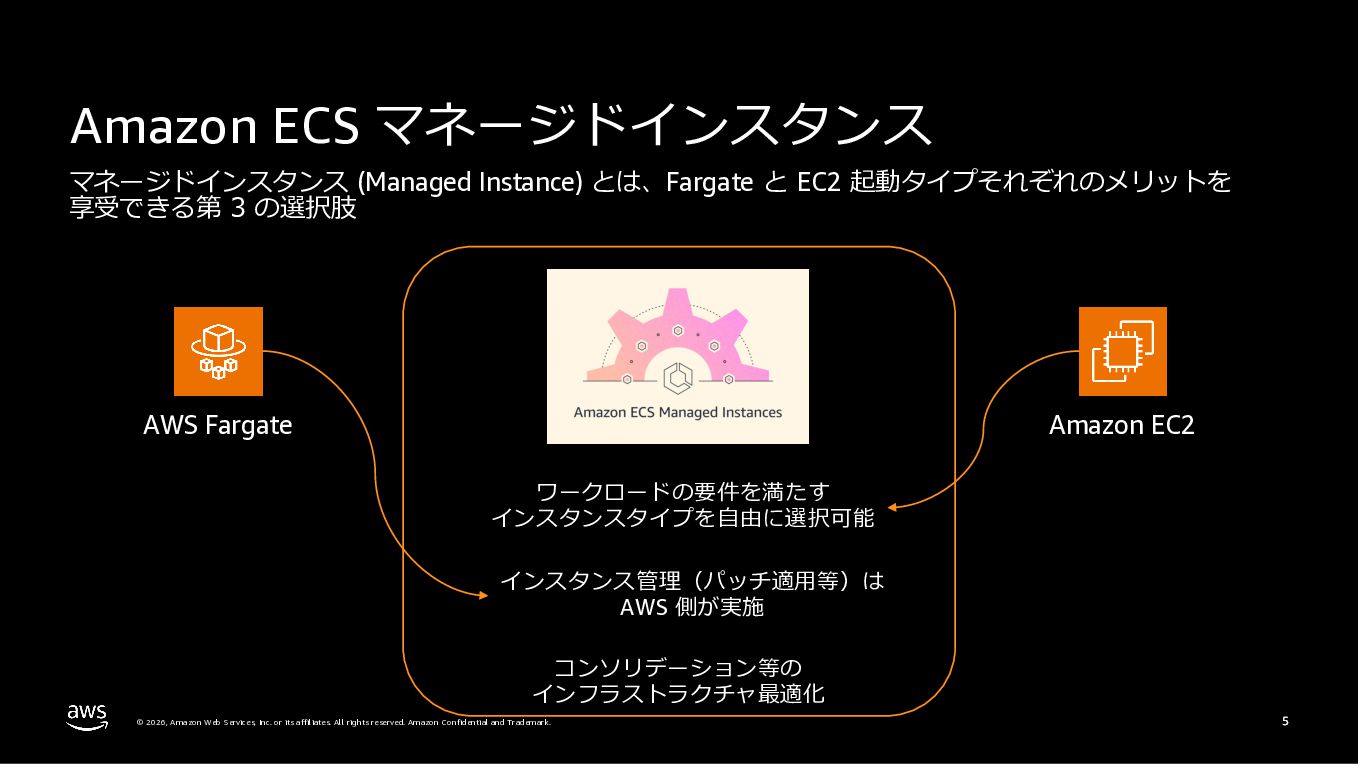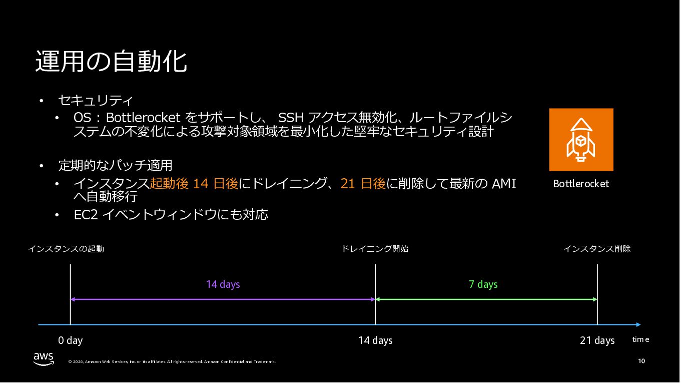 Amazon ECS と Amazon EKS の最新機能、そして MCP(Model Context Protocol)サーバーとの連携による新たな活用シーンについて解説しました。ECS Managed Instances では Fargate と EC2 の利点を組み合わせた第3の選択肢が提供され、GPU インスタンスや大容量メモリへの対応、AWS による自動的なインフラ管理と最適化を実現しています。また、ECS Express Mode ではコンテナイメージと IAM ロールのみでベストプラクティスに基づいた本番環境を即座に構築でき、EKS Auto Mode では Kubernetes クラスター全体のインフラ管理が自動化されることで運用負荷を大幅に軽減します。さらに、フルマネージド型の MCP サーバーにより、AI コーディングアシスタントとの連携を通じて開発効率の向上とトラブルシューティングの迅速化が可能となりました。