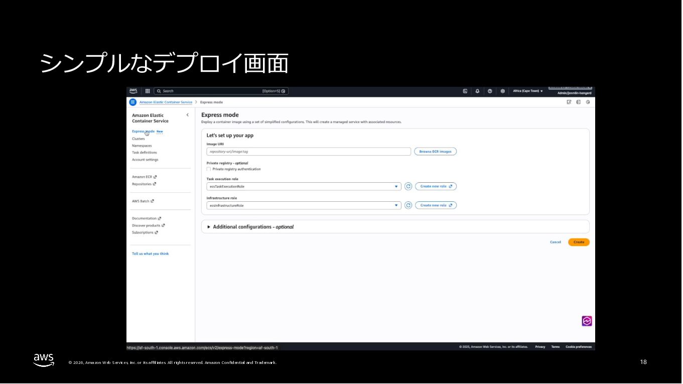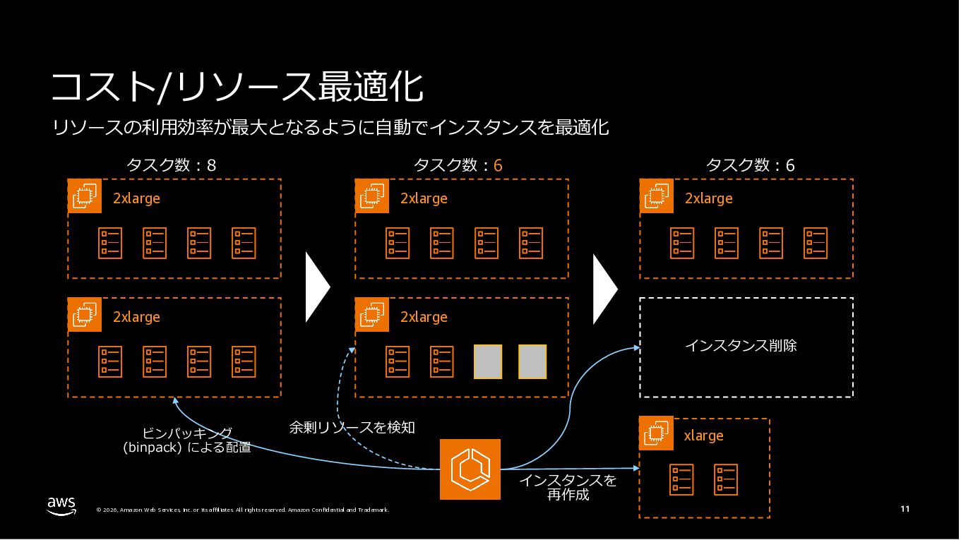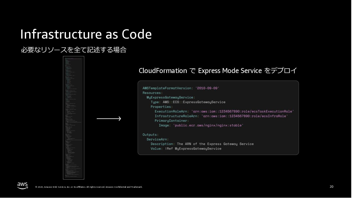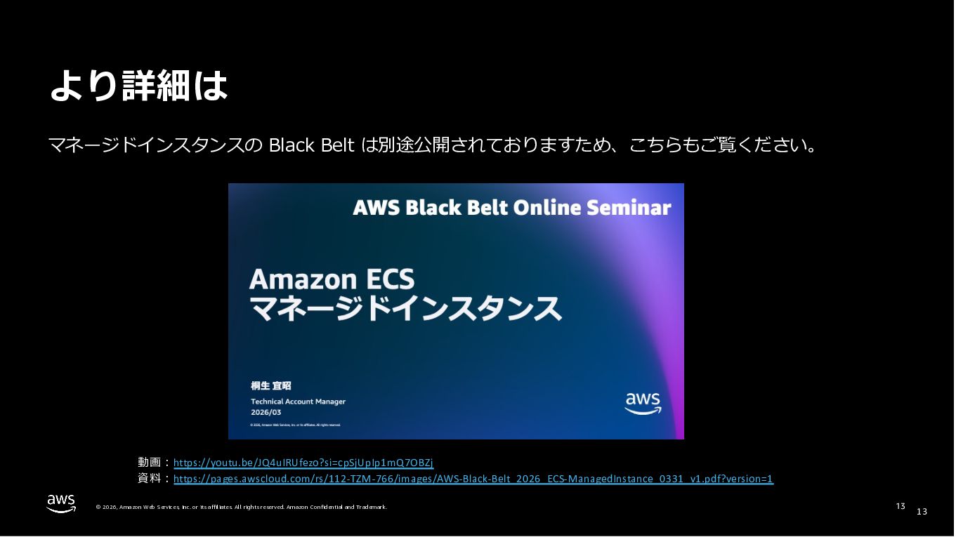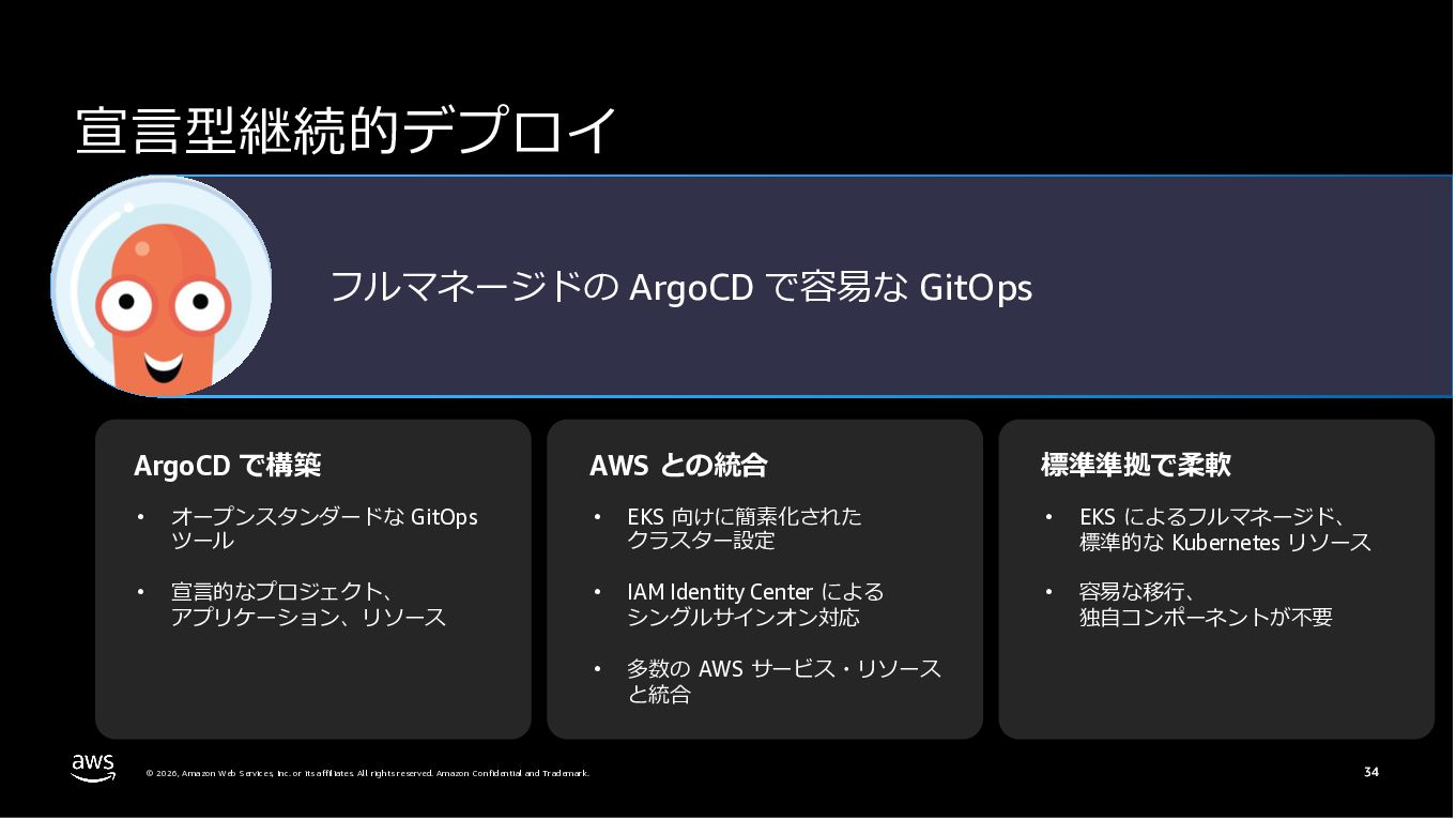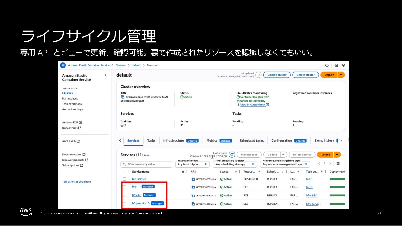 Amazon ECS と Amazon EKS の最新機能、そして MCP(Model Context Protocol)サーバーとの連携による新たな活用シーンについて解説しました。ECS Managed Instances では Fargate と EC2 の利点を組み合わせた第3の選択肢が提供され、GPU インスタンスや大容量メモリへの対応、AWS による自動的なインフラ管理と最適化を実現しています。また、ECS Express Mode ではコンテナイメージと IAM ロールのみでベストプラクティスに基づいた本番環境を即座に構築でき、EKS Auto Mode では Kubernetes クラスター全体のインフラ管理が自動化されることで運用負荷を大幅に軽減します。さらに、フルマネージド型の MCP サーバーにより、AI コーディングアシスタントとの連携を通じて開発効率の向上とトラブルシューティングの迅速化が可能となりました。