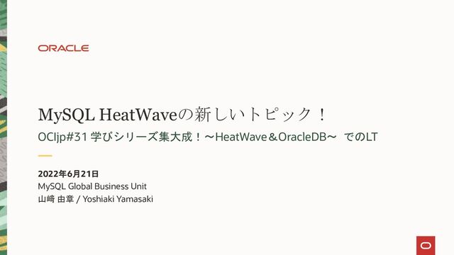 • 指定した行データに対する予測 実行例) 作成したモデルを使って、アヤメのデータを1行だけ与えて品種(class列)を求める HeatWave MLでの「推論」 ※行の場合 SELECT sys.ML_PREDICT_ROW(JSON_OBJECT("sepal length", 7.3, "sepal width", 2.9, "petal length", 6.3, "petal width", 1.8), @iris_model); +---------------------------------------------------------------------------------------------------------------------------------+ | sys.ML_PREDICT_ROW(JSON_OBJECT("sepal length", 7.3, "sepal width", 2.9, "petal length", 6.3, "petal width", 1.8), @iris_model) | +---------------------------------------------------------------------------------------------------------------------------------+ | {"Prediction": "Iris-virginica", "petal width": 1.8, "sepal width": 2.9, "petal length": 6.3, "sepal length": 7.3} | +---------------------------------------------------------------------------------------------------------------------------------+ sepal length :ガクの長さ sepal width :ガクの太さ petal length :花びらの長さ petal width :花びらの太さ class :アヤメの品種 (セトサ種、バージカラー種、バージニカ種)