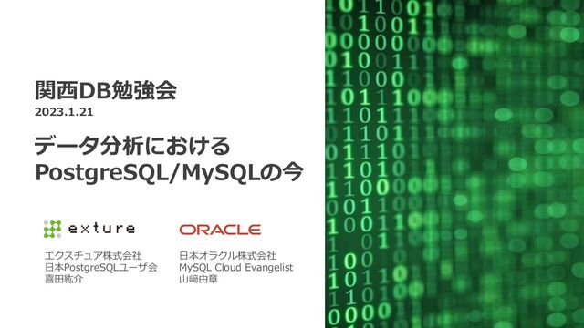sales_date price tokyo 2023-01-01 1200 osaka 2023-01-01 1000 nagoya 2023-01-01 1900 tokyo 2023-01-02 1000 osaka 2023-01-02 1200 nagoya 2023-01-02 1200 tokyo 2023-01-03 1100 osaka 2023-01-03 1700 nagoya 2023-01-03 1600 tokyo 2023-01-04 1300 osaka 2023-01-04 1000 nagoya 2023-01-04 1200 tokyo 2023-01-05 1500 osaka 2023-01-05 1100 nagoya 2023-01-05 1000 area sales_date price row_number tokyo 2023-01-05 1500 1 tokyo 2023-01-04 1300 2 tokyo 2023-01-01 1200 3 tokyo 2023-01-03 1100 4 tokyo 2023-01-02 1000 5 osaka 2023-01-03 1700 1 osaka 2023-01-02 1200 2 osaka 2023-01-05 1100 3 osaka 2023-01-01 1000 4 osaka 2023-01-04 1000 5 nagoya 2023-01-01 1900 1 nagoya 2023-01-03 1600 2 nagoya 2023-01-02 1200 3 nagoya 2023-01-04 1200 4 nagoya 2023-01-05 1000 5 SELECT * ,row_number() OVER (PARTITION BY area ORDER BY price DESC) rn FROM sales SELECT * FROM ( SELECT * ,row_number() OVER (PARTITION BY area ORDER BY price DESC) rn FROM sales) sales_rn WHERE rn <= 3 ; area sales_date price row_number tokyo 2023-01-05 1500 1 tokyo 2023-01-04 1300 2 tokyo 2023-01-01 1200 3 tokyo 2023-01-03 1100 4 tokyo 2023-01-02 1000 5 osaka 2023-01-03 1700 1 osaka 2023-01-02 1200 2 osaka 2023-01-05 1100 3 osaka 2023-01-01 1000 4 osaka 2023-01-04 1000 5 nagoya 2023-01-01 1900 1 nagoya 2023-01-03 1600 2 nagoya 2023-01-02 1200 3 nagoya 2023-01-04 1200 4 nagoya 2023-01-05 1000 5 v14までは不要行を含めたすべて計算したうえで最後にWHERE条件を適用 PostgreSQL15 ではウィンドウ関数処理時点で不要な結果を除去