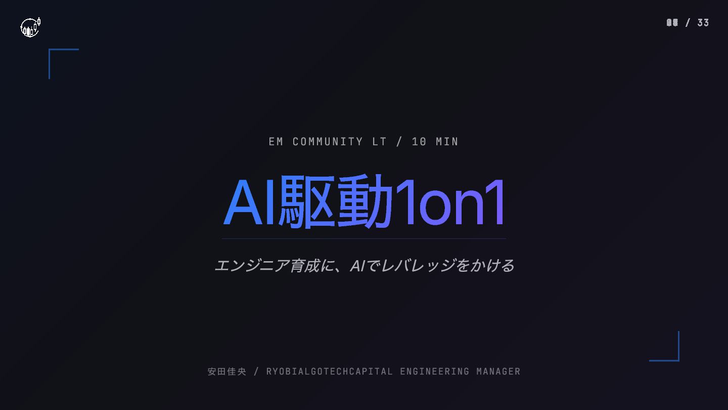 AI駆動1on1 AI駆動1on1 エンジニア育成に、AIでレバレッジをかける EM COMMUNITY LT / 10 MIN 安田佳央