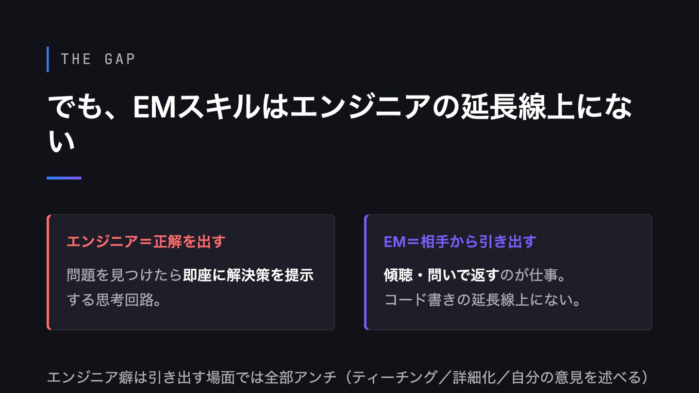 THE GAP でも、EMスキルはエンジニアの延長線上にな い エンジニア癖は引き出す場面では全部アンチ(ティーチング/詳細化/自分の意見を述べる) エンジニア=正解を出す 問題を見つけたら即座に解決策を提示 する思考回路。 EM=相手から引き出す 傾聴・問いで返すのが仕事。