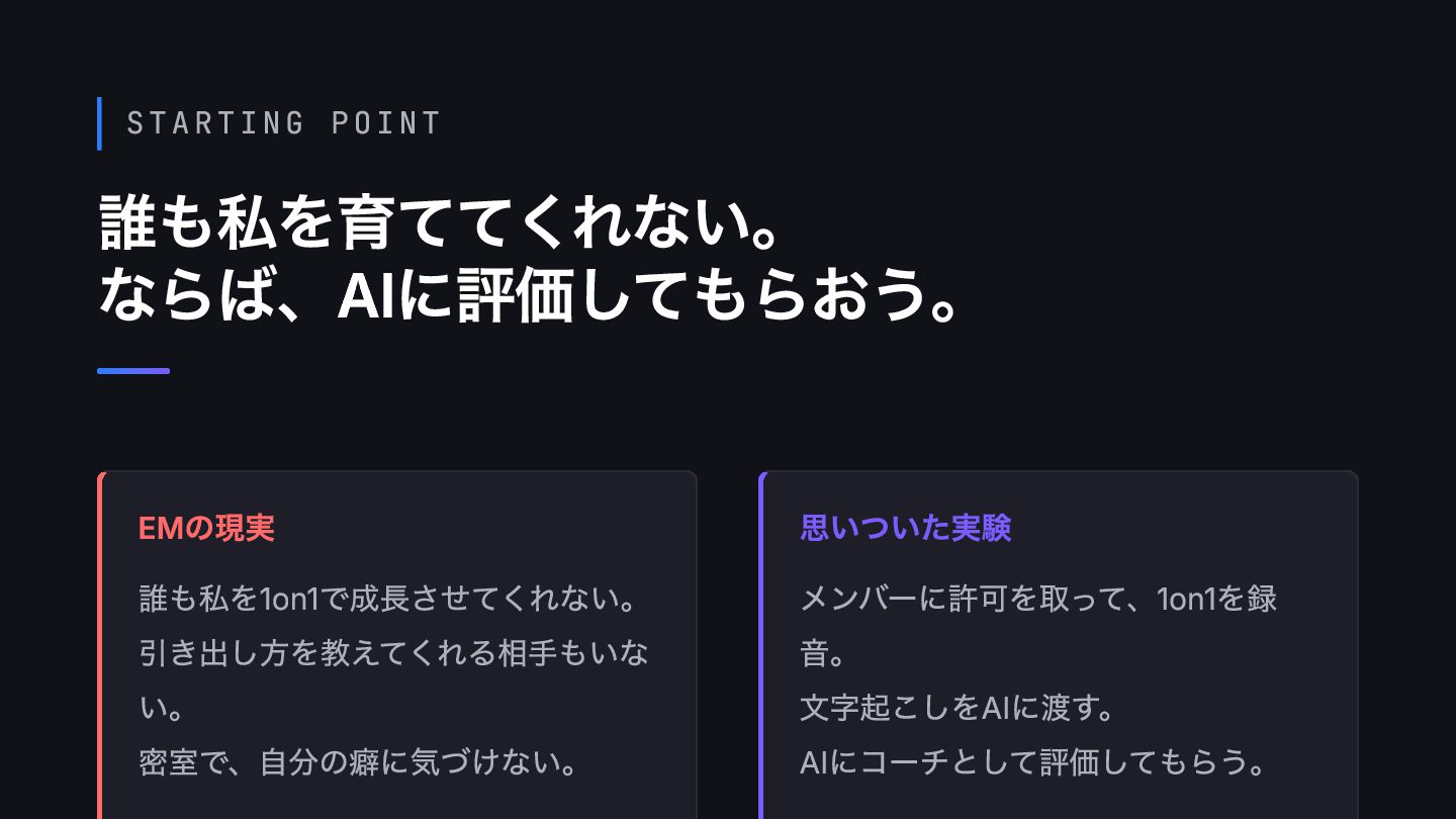 STARTING POINT 誰も私を育ててくれない。 ならば、AIに評価してもらおう。 EMの現実 誰も私を1on1で成長させてくれない。 引き出し方を教えてくれる相手もいな い。 密室で、自分の癖に気づけない。 思いついた実験