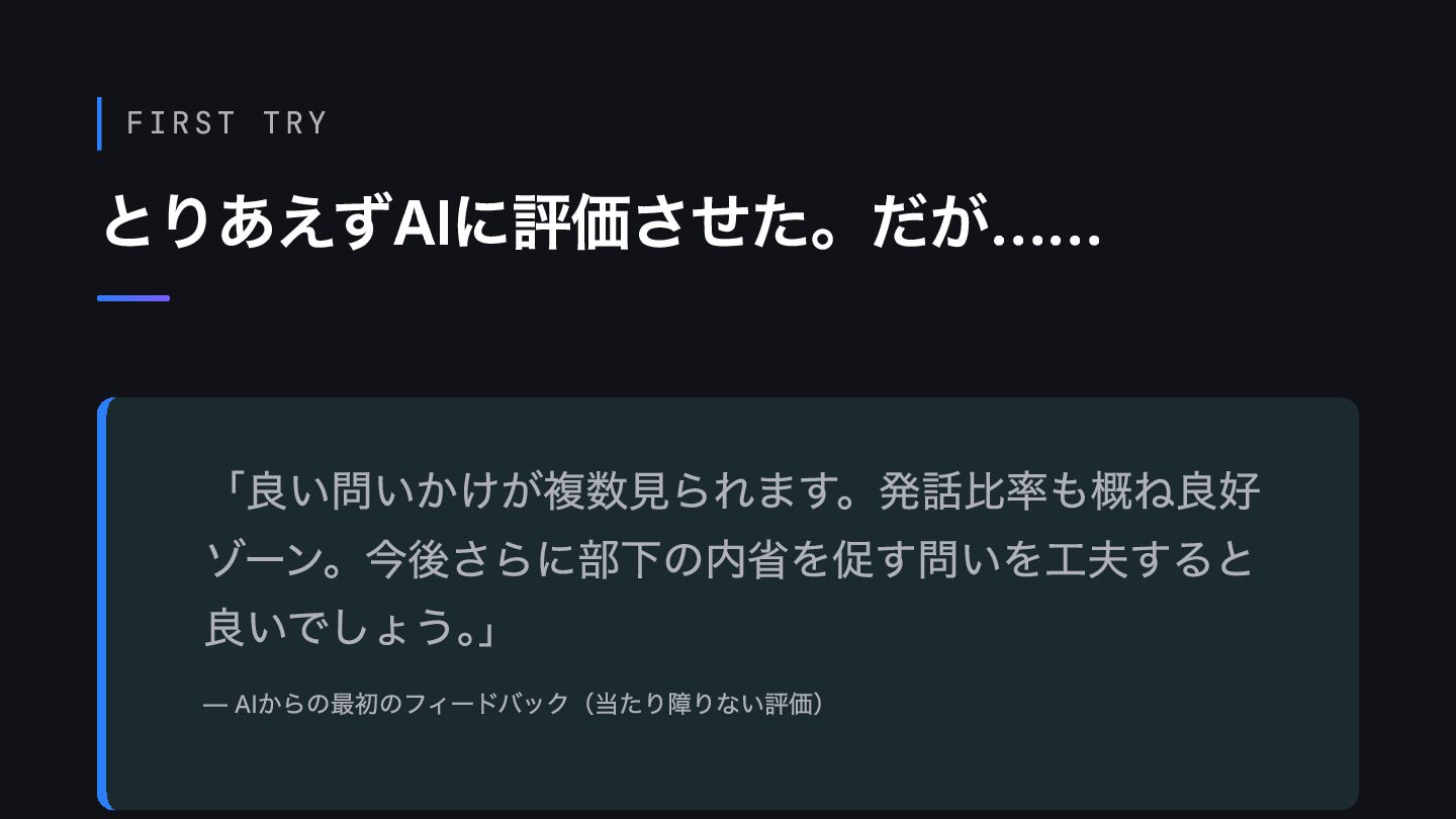 FIRST TRY とりあえずAIに評価させた。だが…… 「良い問いかけが複数見られます。発話比率も概ね良好 ゾーン。今後さらに部下の内省を促す問いを工夫すると 良いでしょう。 」 — AIからの最初のフィードバック(当たり障りない評価)