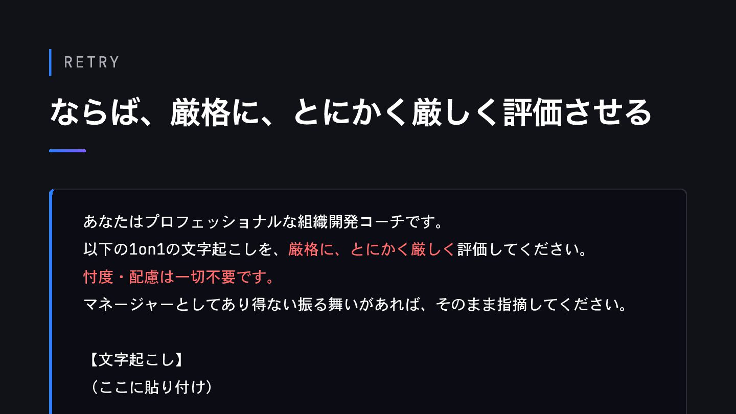 RETRY ならば、厳格に、とにかく厳しく評価させる あなたはプロフェッショナルな組織開発コーチです。 以下の1on1の文字起こしを、厳格に、とにかく厳しく評価してください。 忖度・配慮は一切不要です。 マネージャーとしてあり得ない振る舞いがあれば、そのまま指摘してください。 【文字起こし】 (ここに貼り付け)
