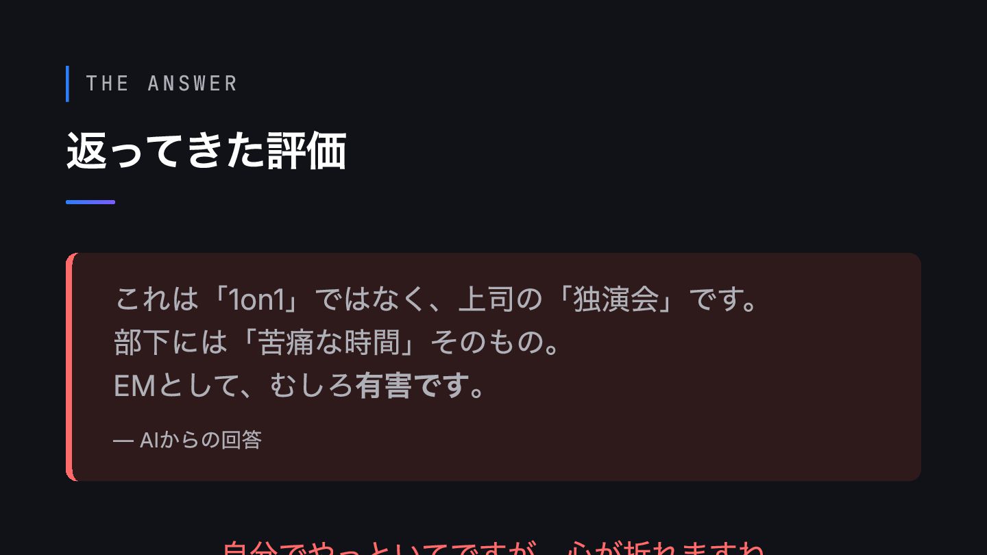 THE ANSWER 返ってきた評価 これは「1on1」ではなく、上司の「独演会」です。 部下には「苦痛な時間」そのもの。 EMとして、むしろ有害です。 — AIからの回答