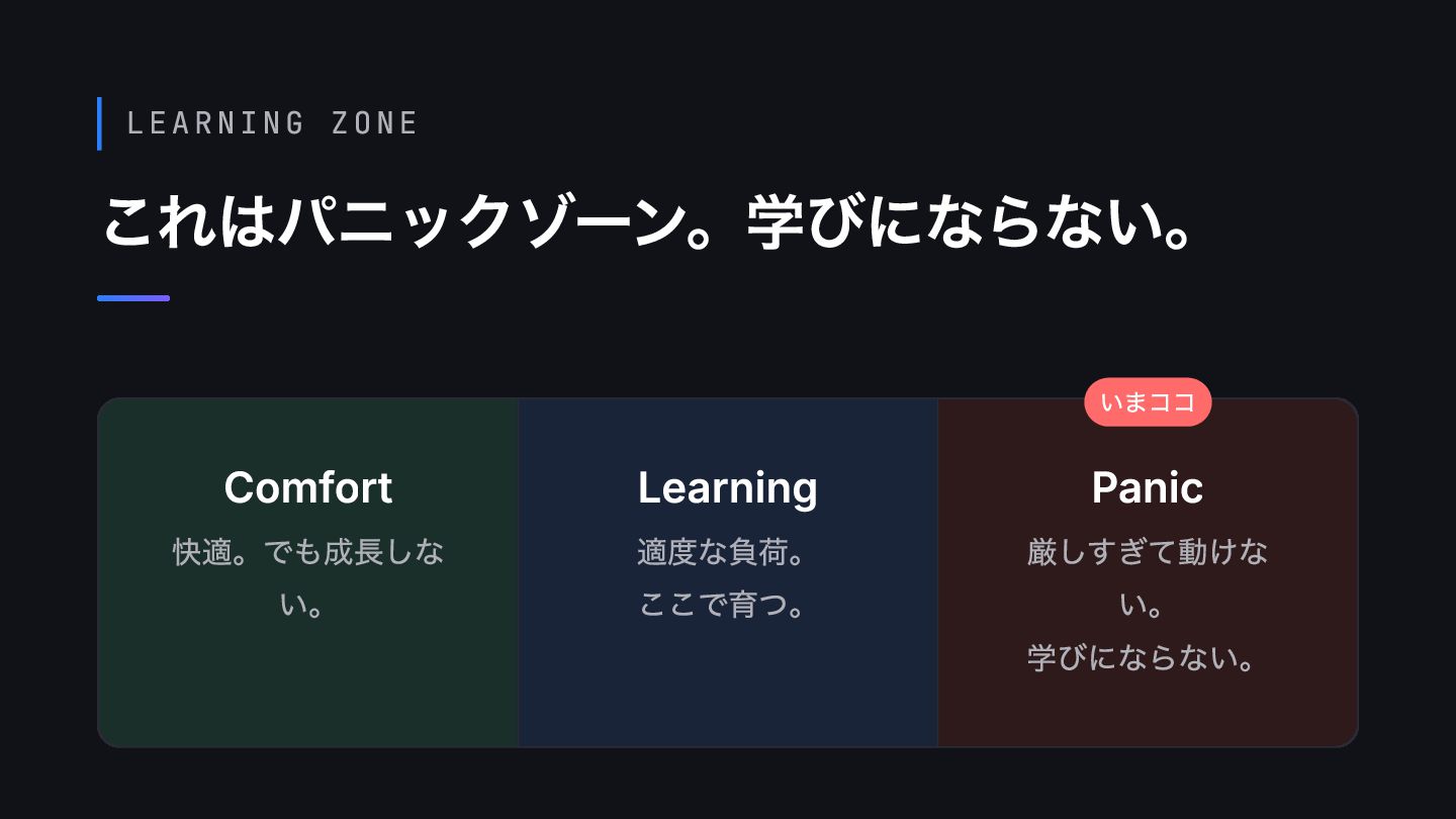 LEARNING ZONE これはパニックゾーン。学びにならない。 Comfort 快適。でも成長しな い。 Learning 適度な負荷。 ここで育つ。 Panic
