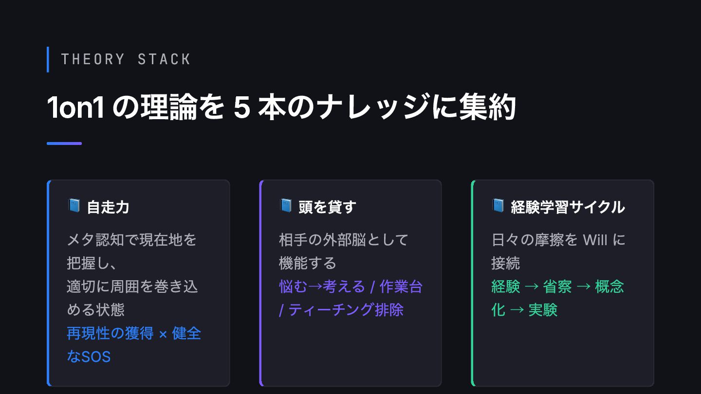THEORY STACK 1on1 の理論を 5 本のナレッジに集約 📘 自走力 メタ認知で現在地を 把握し、