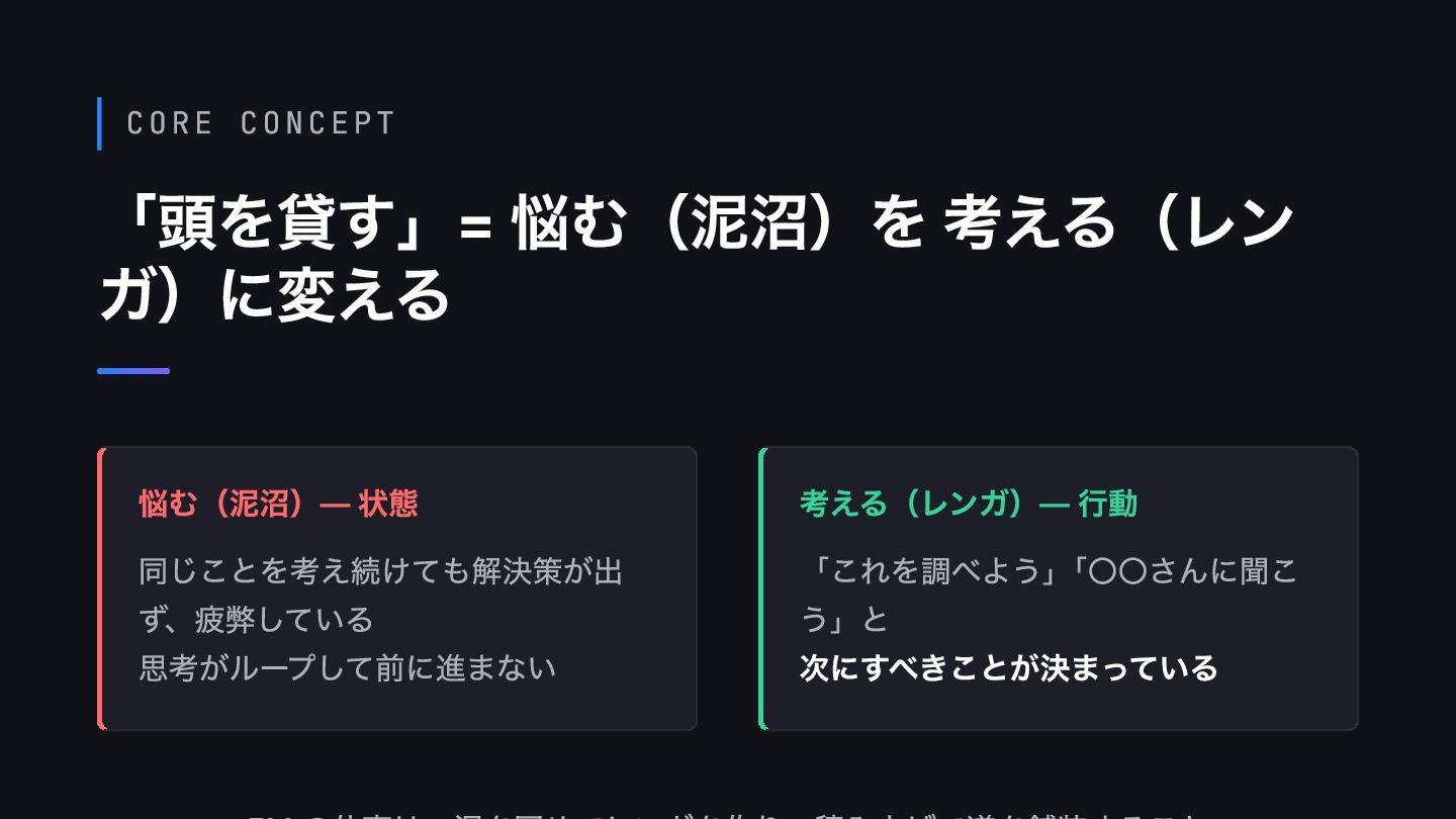 CORE CONCEPT 「頭を貸す」= 悩む(泥沼)を 考える(レン ガ)に変える 悩む(泥沼)— 状態 同じことを考え続けても解決策が出 ず、疲弊している