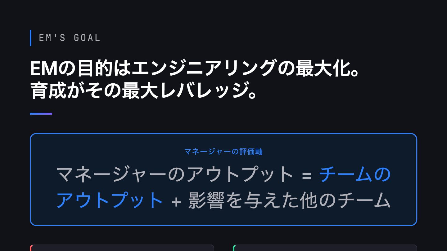 EM'S GOAL EMの目的はエンジニアリングの最大化。 育成がその最大レバレッジ。 マネージャーの評価軸 マネージャーのアウトプット = チームの アウトプット +