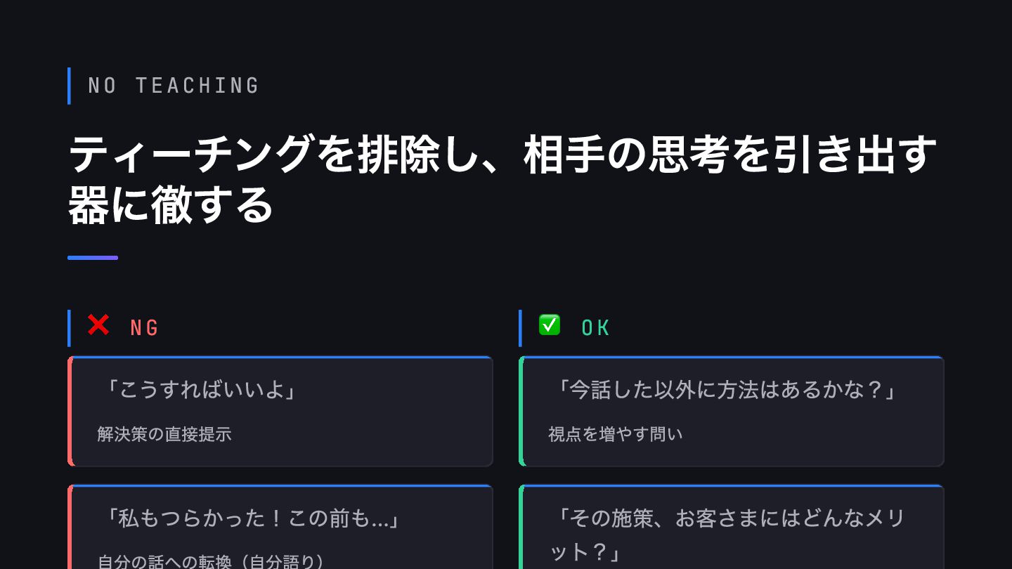 NO TEACHING ティーチングを排除し、相手の思考を引き出す 器に徹する ❌ NG ✅ OK 「こうすればいいよ」 解決策の直接提示