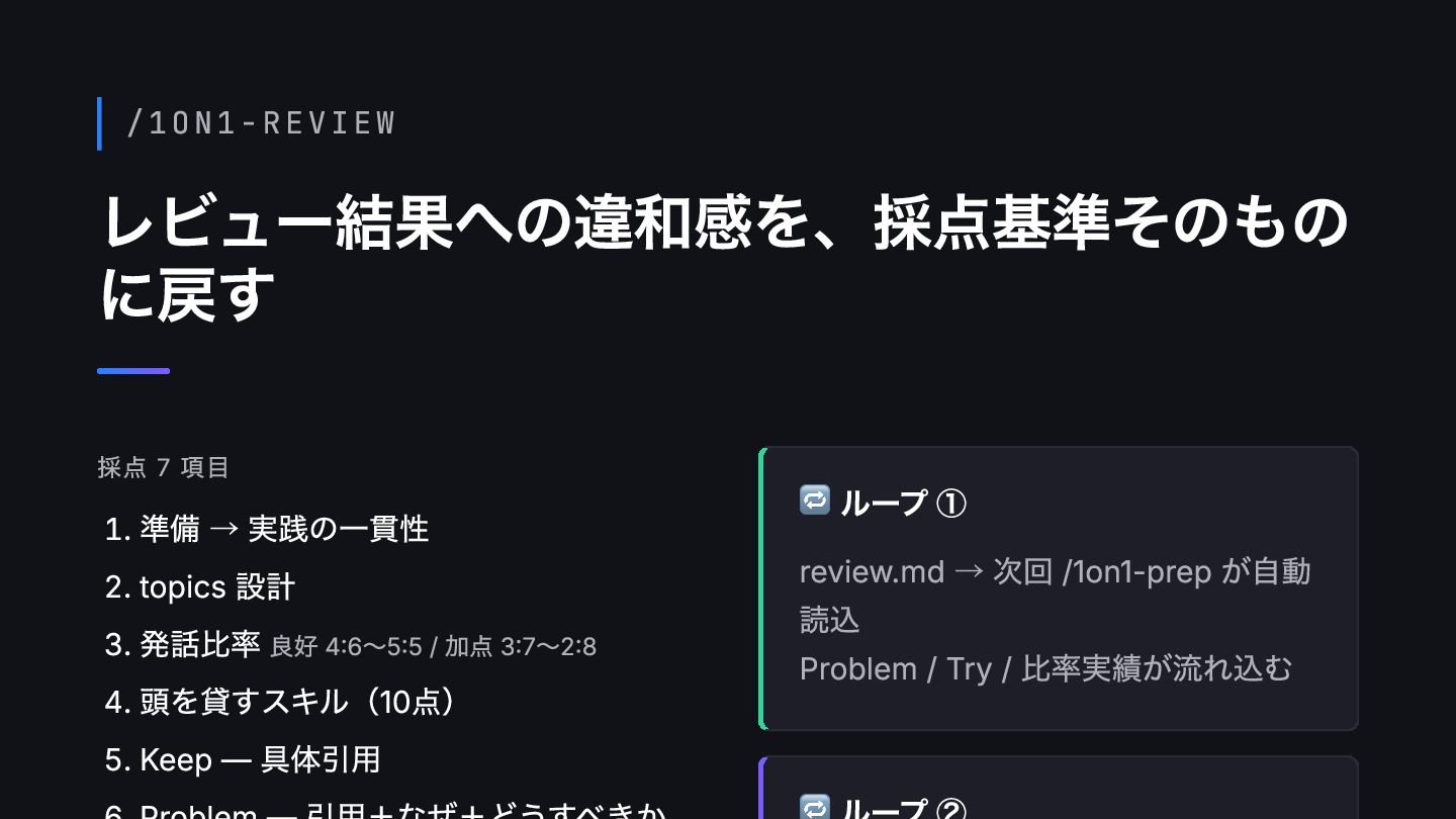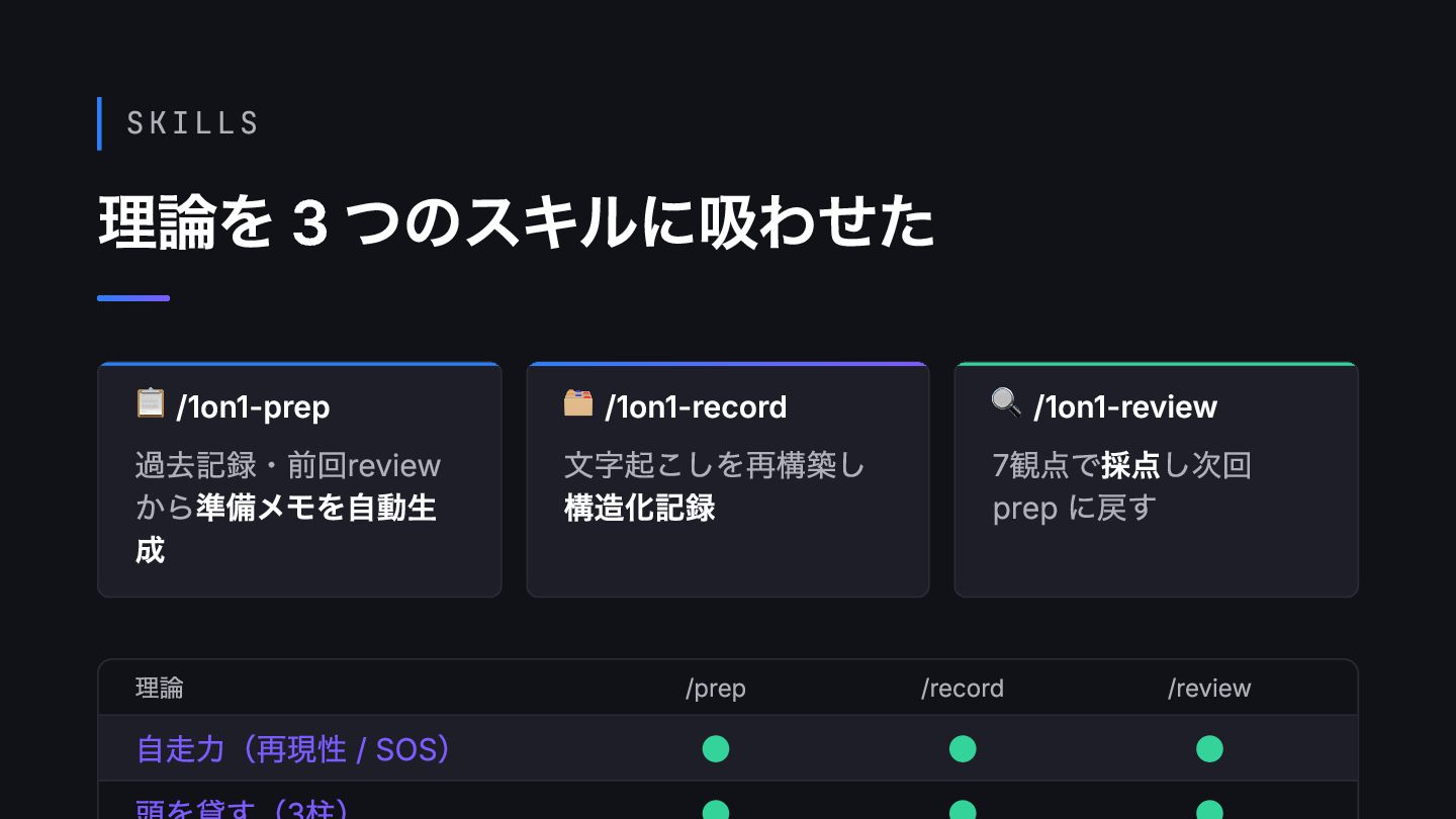 SOS) • • • 📋 /1on1-prep 過去記録・前回review から準備メモを自動生 成 🗂️ /1on1-record 文字起こしを再構築し 構造化記録 🔍 /1on1-review 7観点で採点し次回 prep に戻す