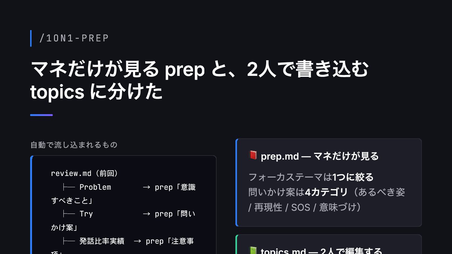 /1ON1-PREP マネだけが見る prep と、2人で書き込む topics に分けた 自動で流し込まれるもの review.md(前回) ├─ Problem