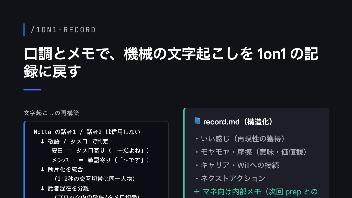 は信用しない ↓ 敬語 / タメ口 で判定 安田 = タメ口寄り(「〜だよね」) メンバー = 敬語寄り(「〜です」) ↓ 断片化を統合 (1-2秒の交互切替は同一人物) ↓ 話者混在を分離 📘 record.md(構造化) ・いい感じ(再現性の獲得) ・モヤモヤ・摩擦(意味・価値観) ・キャリア・Willへの接続 ・ネクストアクション + マネ向け内部メモ(次回 prep との