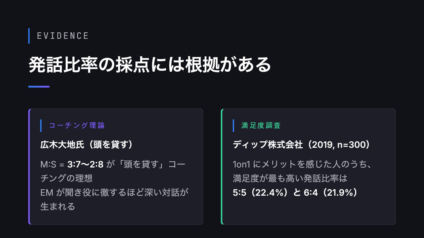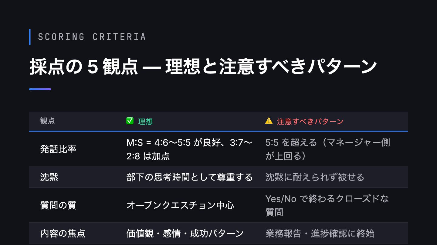 ⚠️ 注意すべきパターン 発話比率 M:S = 4:6〜5:5 が良好、3:7〜 2:8 は加点 5:5 を超える(マネージャー側 が上回る) 沈黙 部下の思考時間として尊重する 沈黙に耐えられず被せる 質問の質 オープンクエスチョン中心 Yes/No で終わるクローズドな 質問 内容の焦点 価値観・感情・成功パターン 業務報告・進捗確認に終始