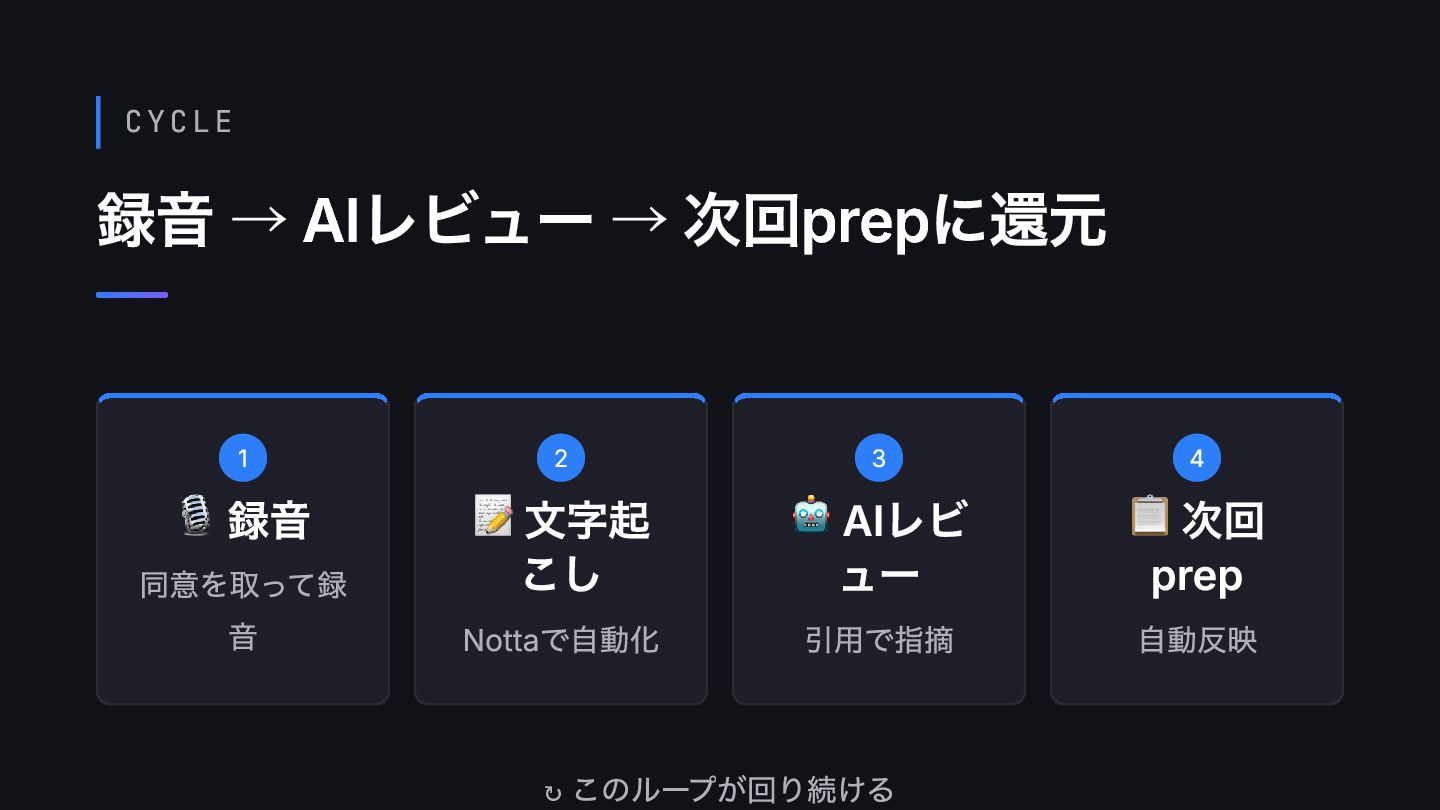 音 2 📝 文字起 こし Nottaで自動化 3 🤖 AIレビ ュー 引用で指摘 4 📋 次回 prep 自動反映 ↻ このループが回り続ける
