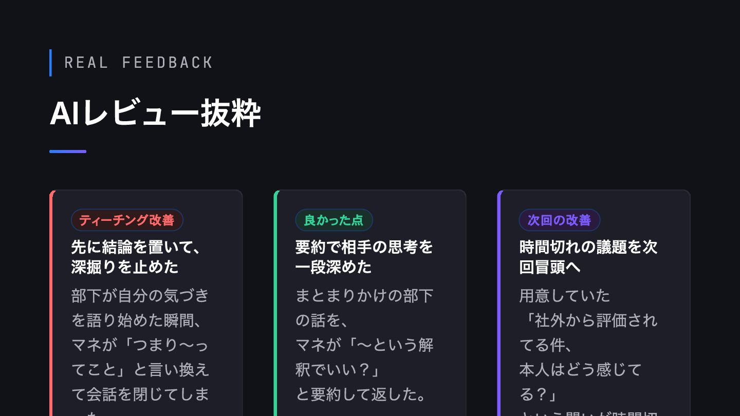 REAL FEEDBACK AIレビュー抜粋 ティーチング改善 先に結論を置いて、 深掘りを止めた 部下が自分の気づき を語り始めた瞬間、 マネが「つまり〜っ てこと」と言い換え