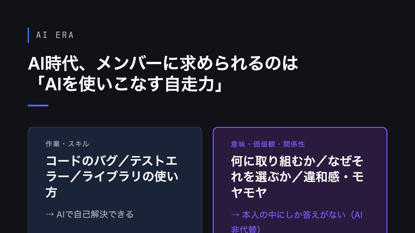 AI ERA AI時代、メンバーに求められるのは 「AIを使いこなす自走力」 作業・スキル コードのバグ/テストエ ラー/ライブラリの使い 方 → AIで自己解決できる