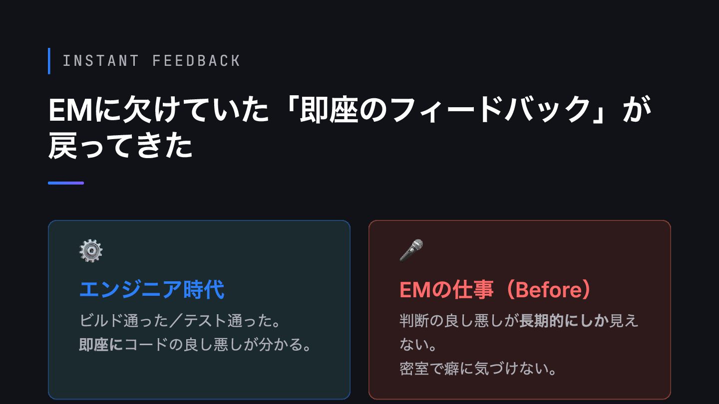 INSTANT FEEDBACK EMに欠けていた「即座のフィードバック」が 戻ってきた ⚙️ エンジニア時代 ビルド通った/テスト通った。 即座にコードの良し悪しが分かる。 🎤 EMの仕事(Before)
