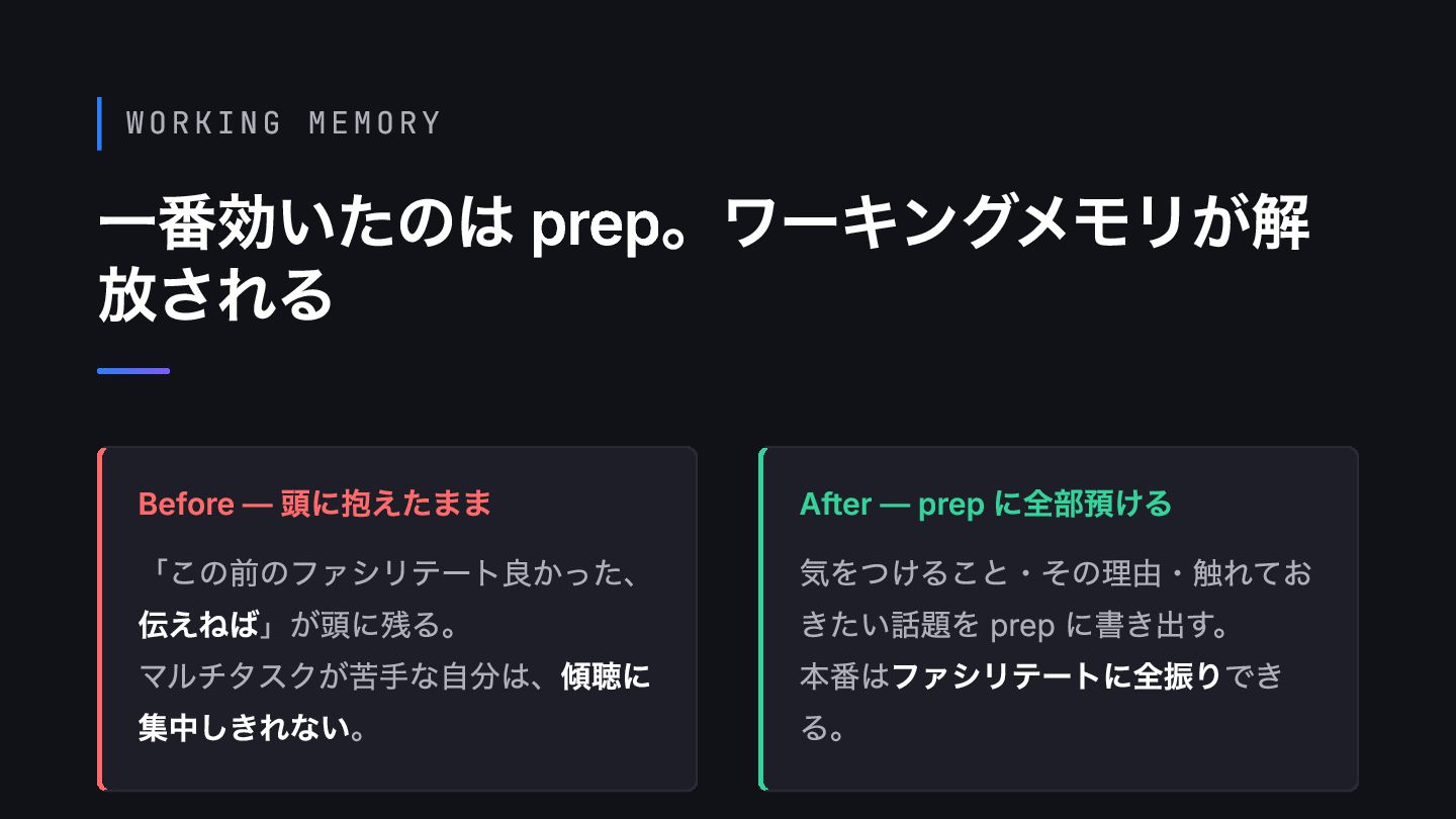 マルチタスクが苦手な自分は、傾聴に 集中しきれない。 After — prep に全部預ける 気をつけること・その理由・触れてお きたい話題を prep に書き出す。 本番はファシリテートに全振りでき る。
