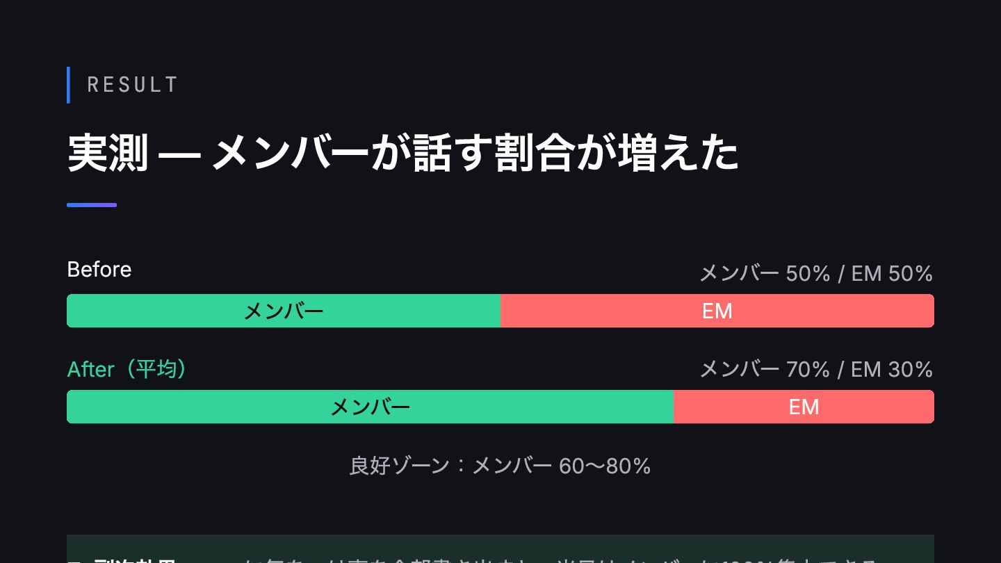 RESULT 実測 — メンバーが話す割合が増えた Before メンバー 50% / EM 50%
