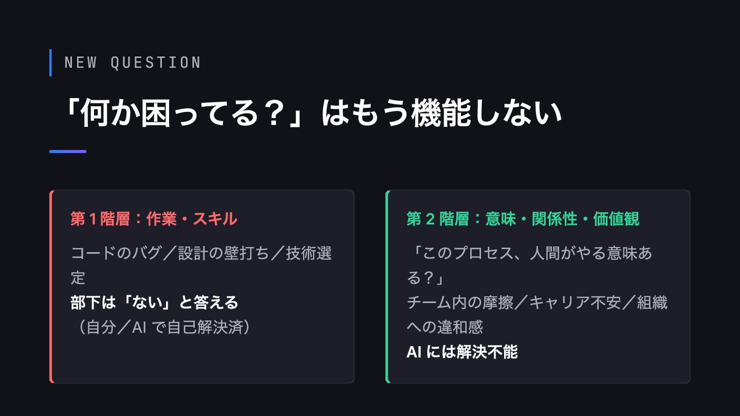 NEW QUESTION 「何か困ってる?」はもう機能しない 第 1 階層:作業・スキル コードのバグ/設計の壁打ち/技術選 定 部下は「ない」と答える (自分/AI