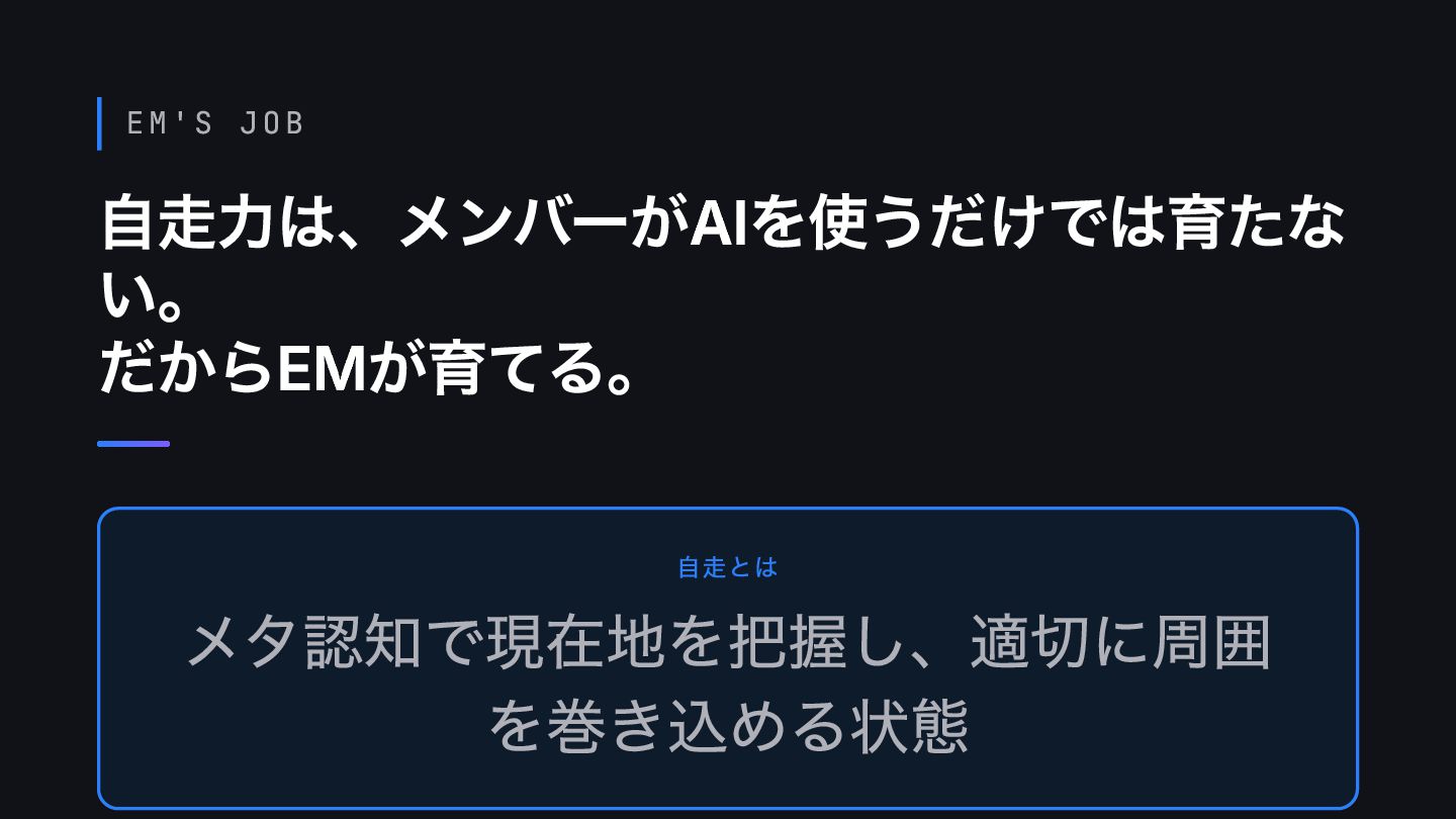 EM'S JOB 自走力は、メンバーがAIを使うだけでは育たな い。 だからEMが育てる。 自走とは メタ認知で現在地を把握し、適切に周囲 を巻き込める状態