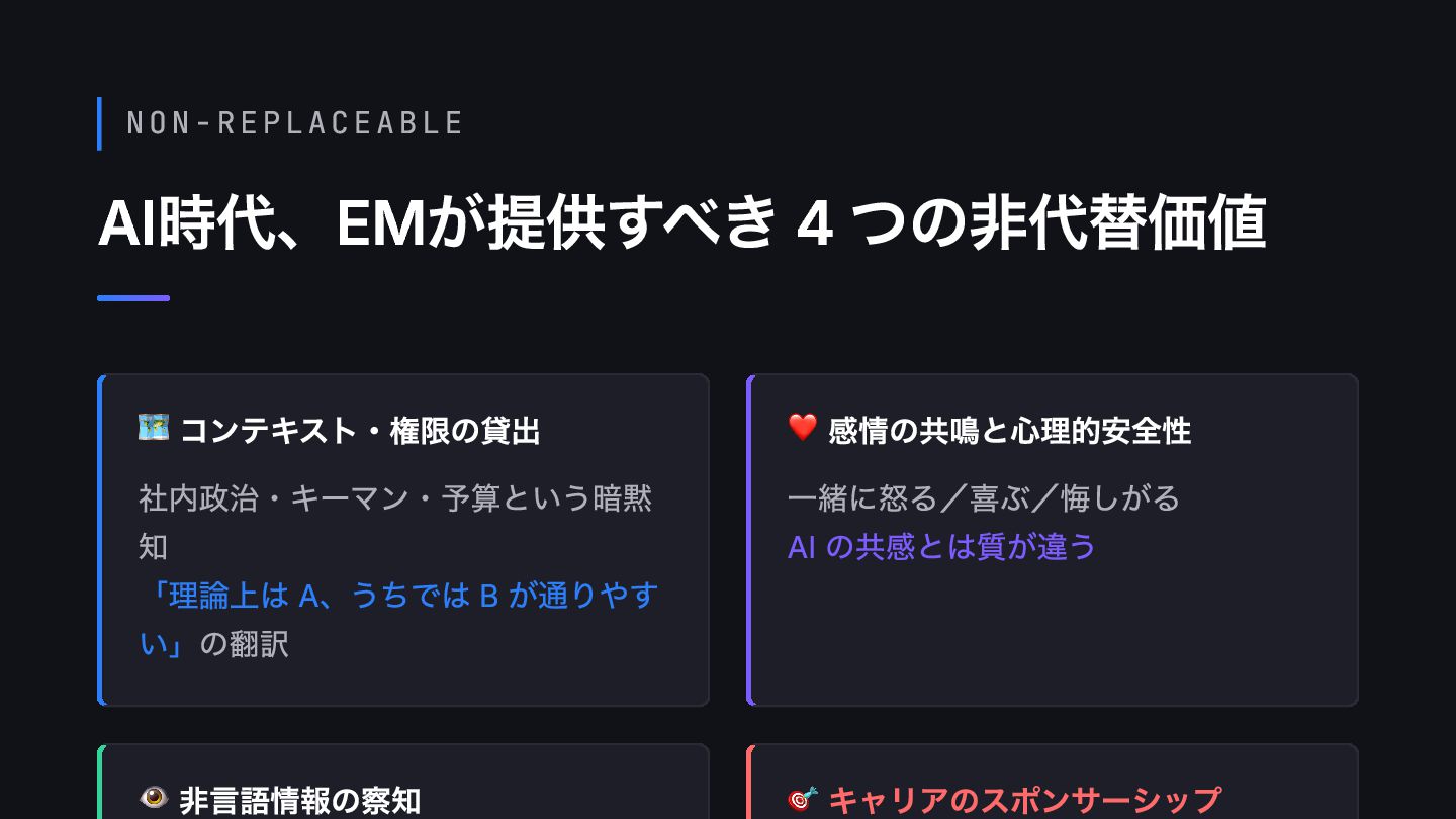 NON-REPLACEABLE AI時代、EMが提供すべき 4 つの非代替価値 🗺️ コンテキスト・権限の貸出 社内政治・キーマン・予算という暗黙 知 「理論上は A、うちでは