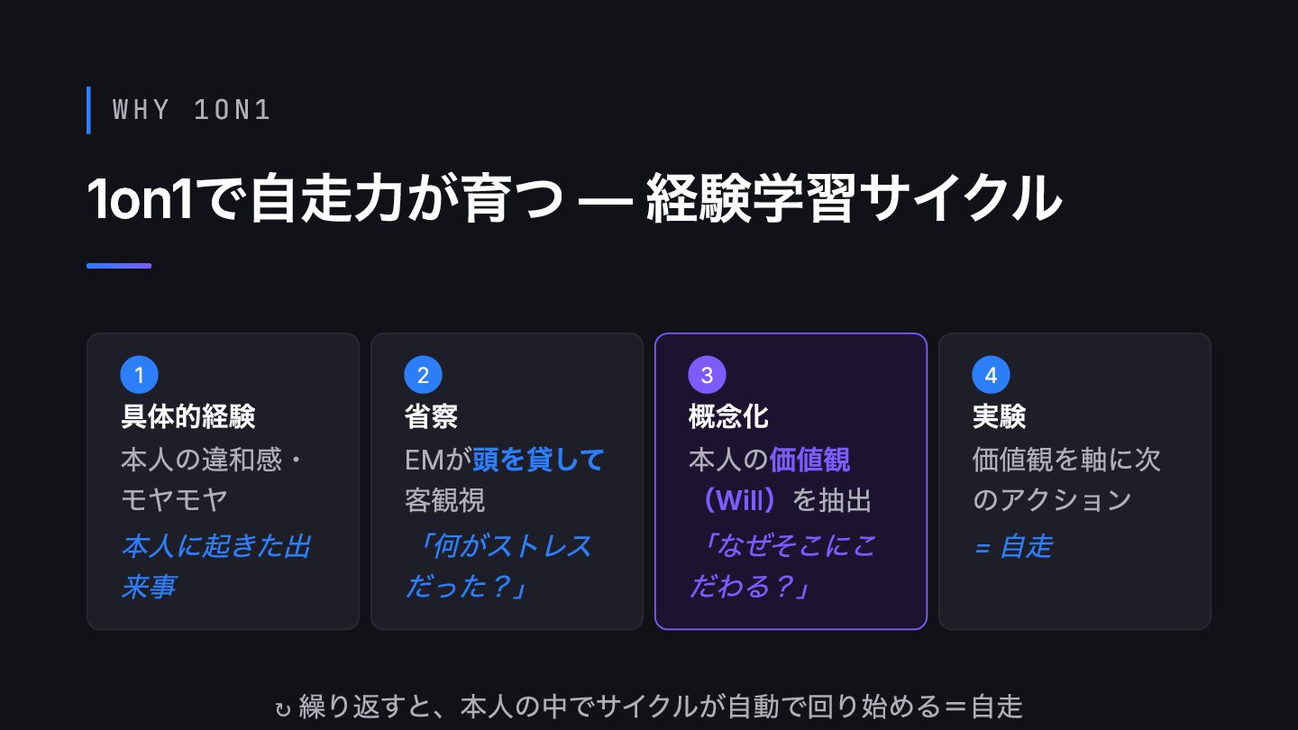 WHY 1ON1 1on1で自走力が育つ — 経験学習サイクル ↻ 繰り返すと、本人の中でサイクルが自動で回り始める=自走 1 具体的経験 本人の違和感・