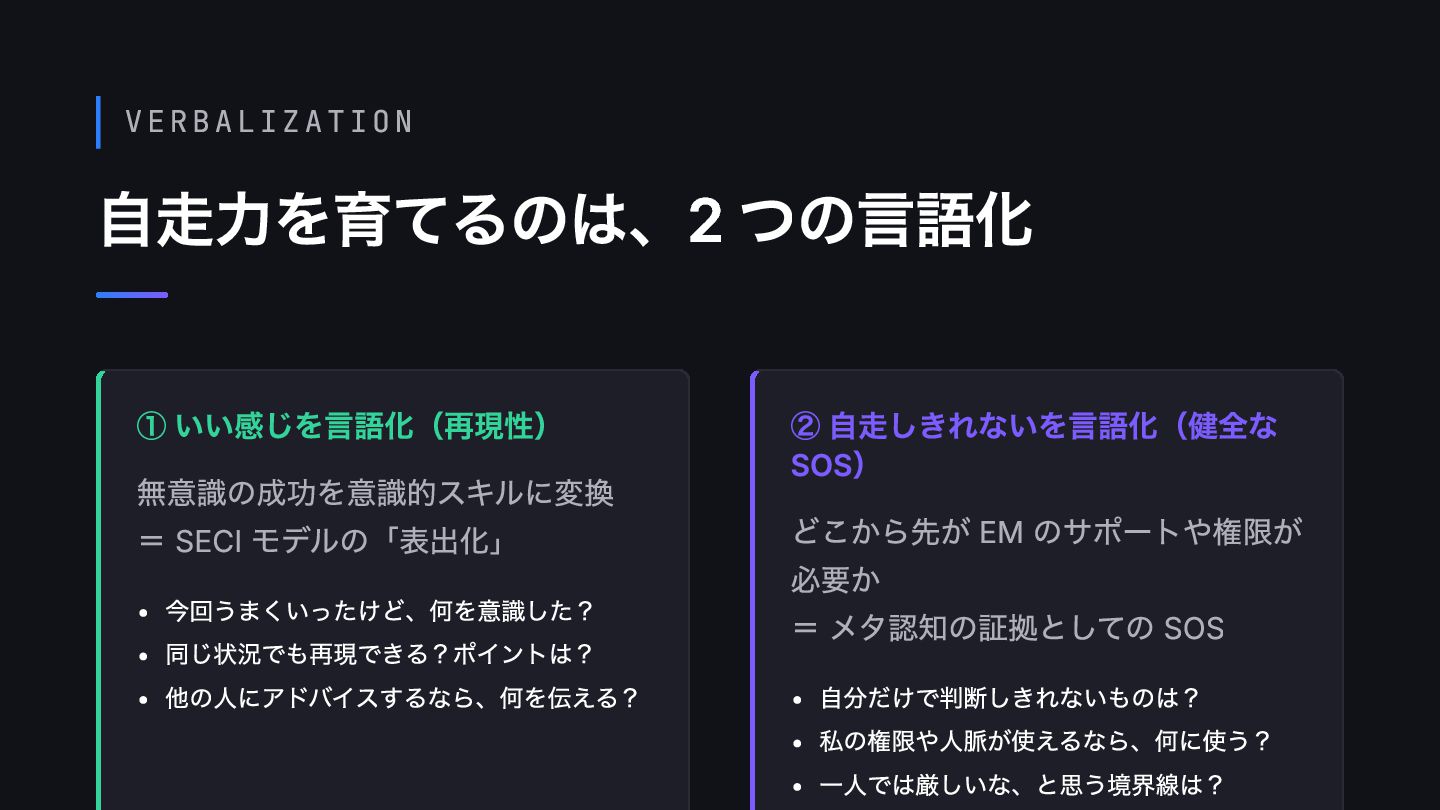 同じ状況でも再現できる?ポイントは? 他の人にアドバイスするなら、何を伝える? ② 自走しきれないを言語化(健全な SOS) どこから先が EM のサポートや権限が 必要か = メタ認知の証拠としての SOS 自分だけで判断しきれないものは? 私の権限や人脈が使えるなら、何に使う? 一人では厳しいな、と思う境界線は?