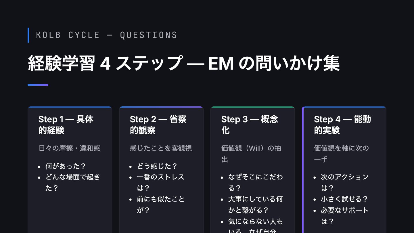 モヤモヤ 本人に起きた出 来事 2 省察 EMが頭を貸して 客観視 「何がストレス だった?」 3 概念化 本人の価値観 (Will)を抽出 「なぜそこにこ だわる?」 4 実験 価値観を軸に次 のアクション = 自走