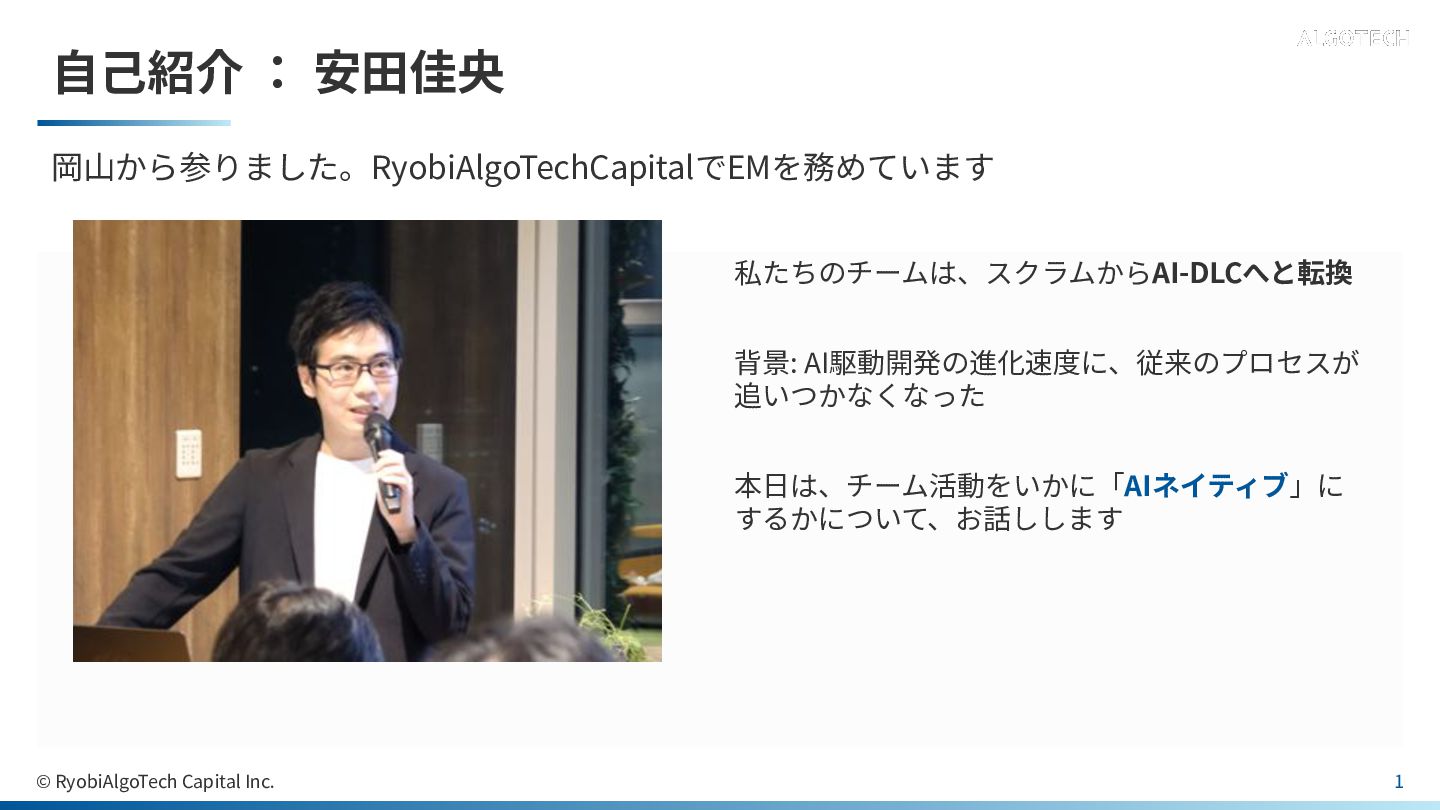 ⾃⼰紹介 : 安⽥佳央 岡⼭から参りました。RyobiAlgoTechCapitalでEMを務めています 私たちのチームは、スクラムからAI-DLCへと転換 背景: AI駆動開発の進化速度に、従来のプロセスが 追いつかなくなった 本⽇は、チーム活動をいかに「AIネイティブ」に するかについて、お話しします