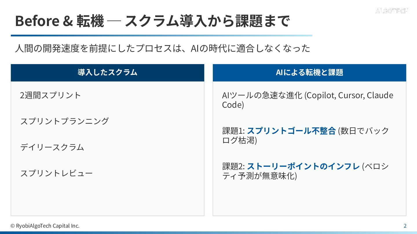 スプリントレビュー AIによる転機と課題 AIツールの急速な進化 (Copilot, Cursor, Claude Code) 課題1: スプリントゴール不整合 (数⽇でバック ログ枯渇) 課題2: ストーリーポイントのインフレ (ベロシ ティ予測が無意味化) © RyobiAlgoTech Capital Inc. 2