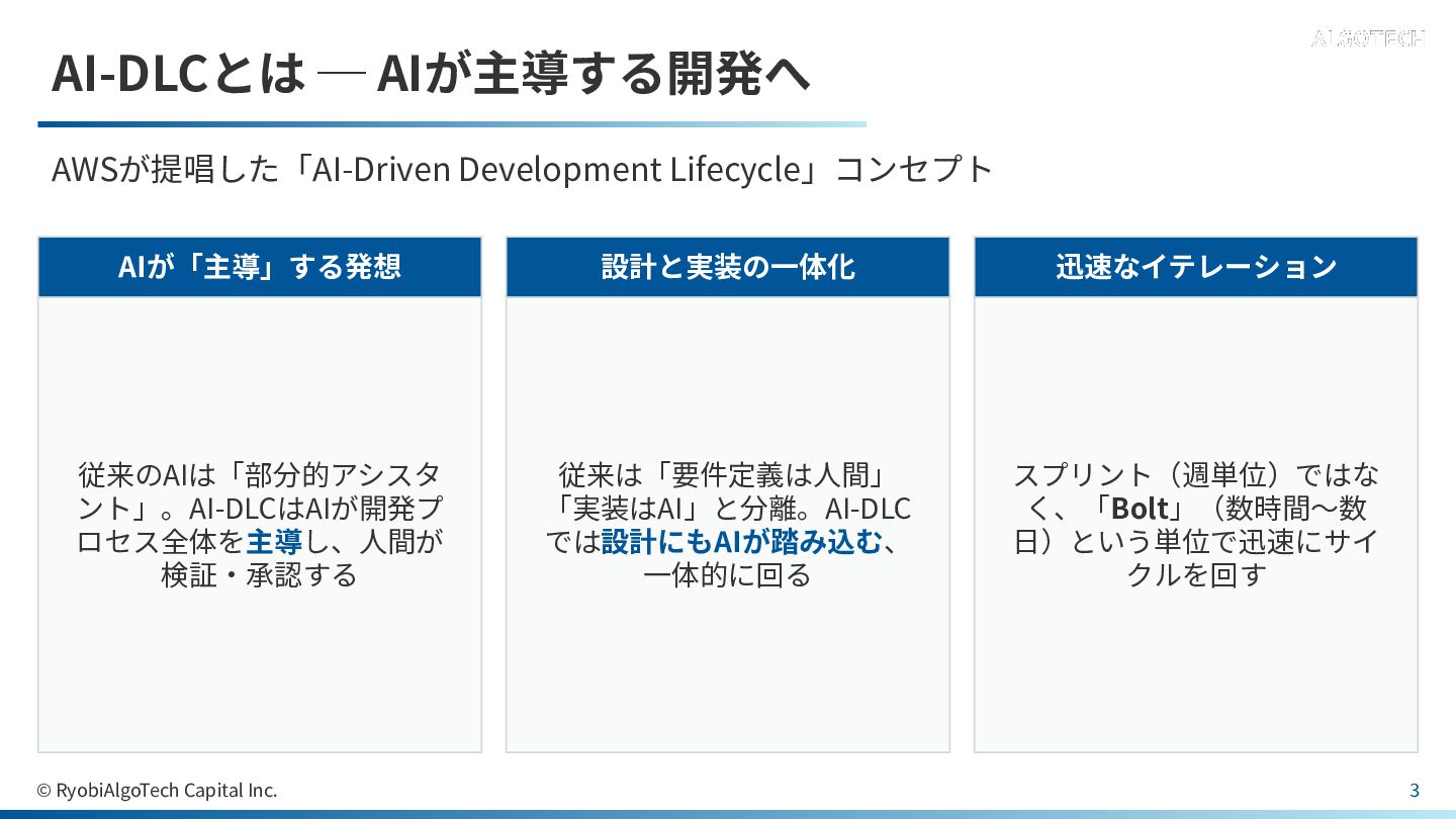 AI-DLCとは ─ AIが主導する開発へ AWSが提唱した「AI-Driven Development Lifecycle」コンセプト AIが「主導」する発想 従来のAIは「部分的アシスタ ント」。AI-DLCはAIが開発プ ロセス全体を主導し、⼈間が