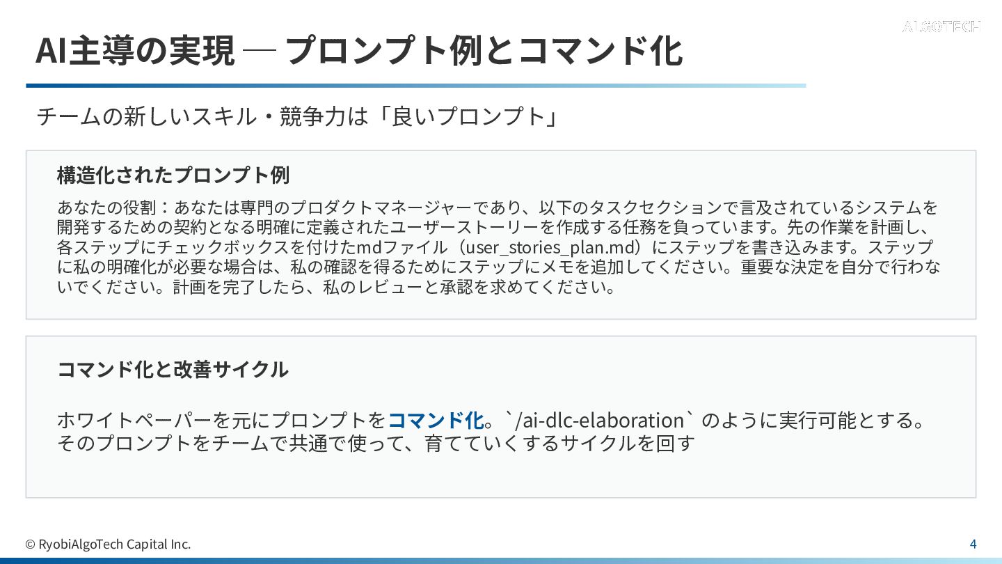 コマンド化と改善サイクル ホワイトペーパーを元にプロンプトをコマンド化。`/ai-dlc-elaboration` のように実⾏可能とする。 そのプロンプトをチームで共通で使って、育てていくするサイクルを回す © RyobiAlgoTech Capital Inc. 4
