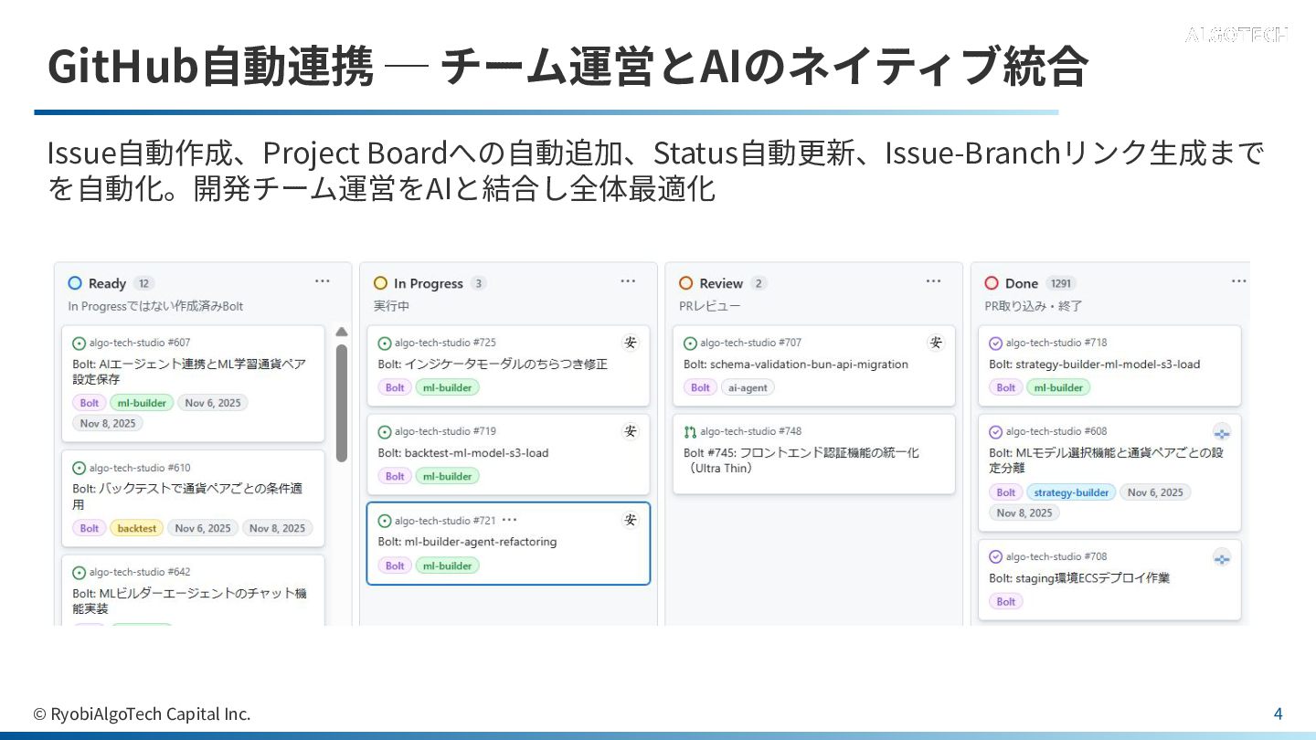 GitHub⾃動連携 ─ チーム運営とAIのネイティブ統合 Issue⾃動作成、Project Boardへの⾃動追加、Status⾃動更新、Issue-Branchリンク⽣成まで を⾃動化。開発チーム運営をAIと結合し全体最適化 © RyobiAlgoTech Capital Inc.