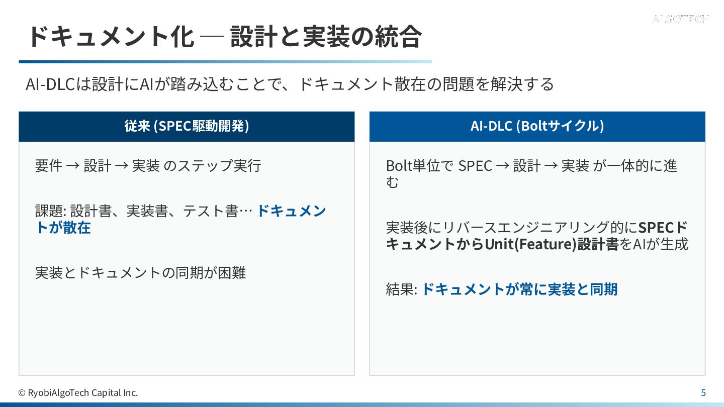 ドキュメント化 ─ 設計と実装の統合 AI-DLCは設計にAIが踏み込むことで、ドキュメント散在の問題を解決する 従来 (SPEC駆動開発) 要件 → 設計 →