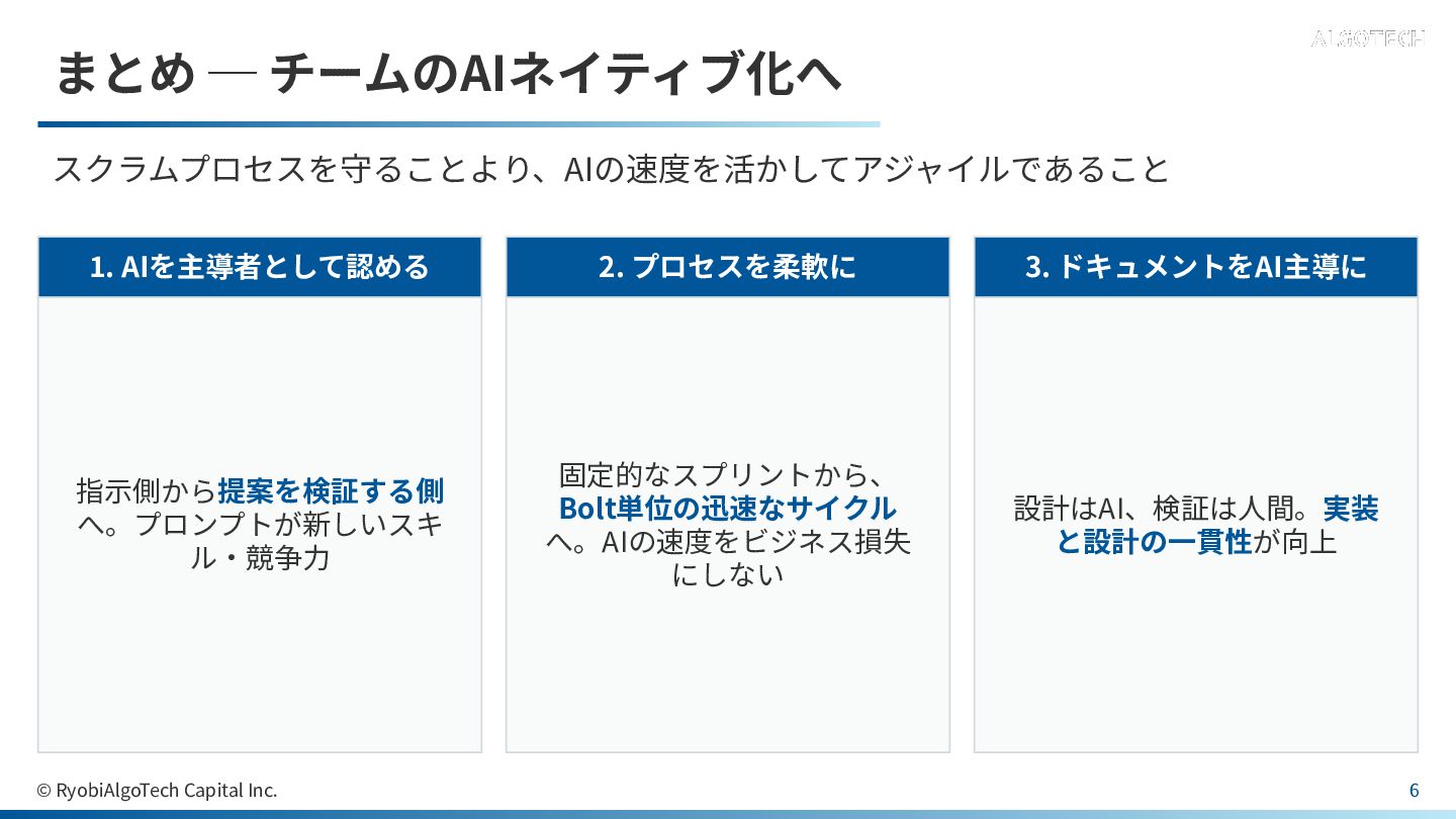 プロセスを柔軟に 固定的なスプリントから、 Bolt単位の迅速なサイクル へ。AIの速度をビジネス損失 にしない 3. ドキュメントをAI主導に 設計はAI、検証は⼈間。実装 と設計の⼀貫性が向上 © RyobiAlgoTech Capital Inc. 6